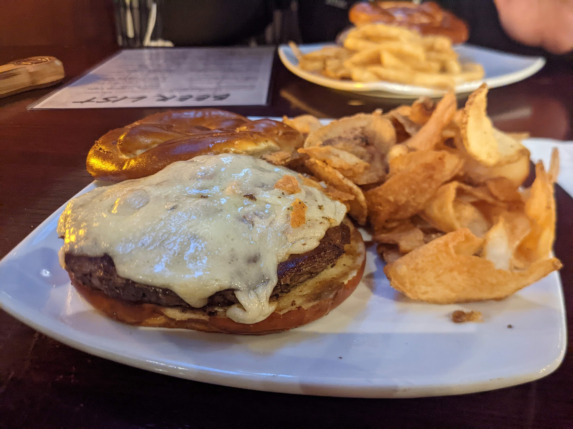 The Irishman sounded so good we both ordered it, and were both disappointed. The menu had the following description: "Two special blend smash burgers grilled and topped with our beer bacon jam and Irish aged sharp cheddar. Served on a bun." There was no indication of this being on a pretzel bun, so that was disappointing for me, as I don't like them, so I moved the bun aside. We both quickly discovered that neither plate had two smash patties, rather one slightly ticker patty that lacked flavor. The melted cheese looked appealing, but it very much tasted like Swiss cheese, certainly not aged Irish cheddar, so another disappointment. At least there would be bacon underneath the cheese.. or so we thought... Nope, just broken bits of cheap, sad looking bacon. Chips with one, they were fine. Fries with the other, which were average fries.
