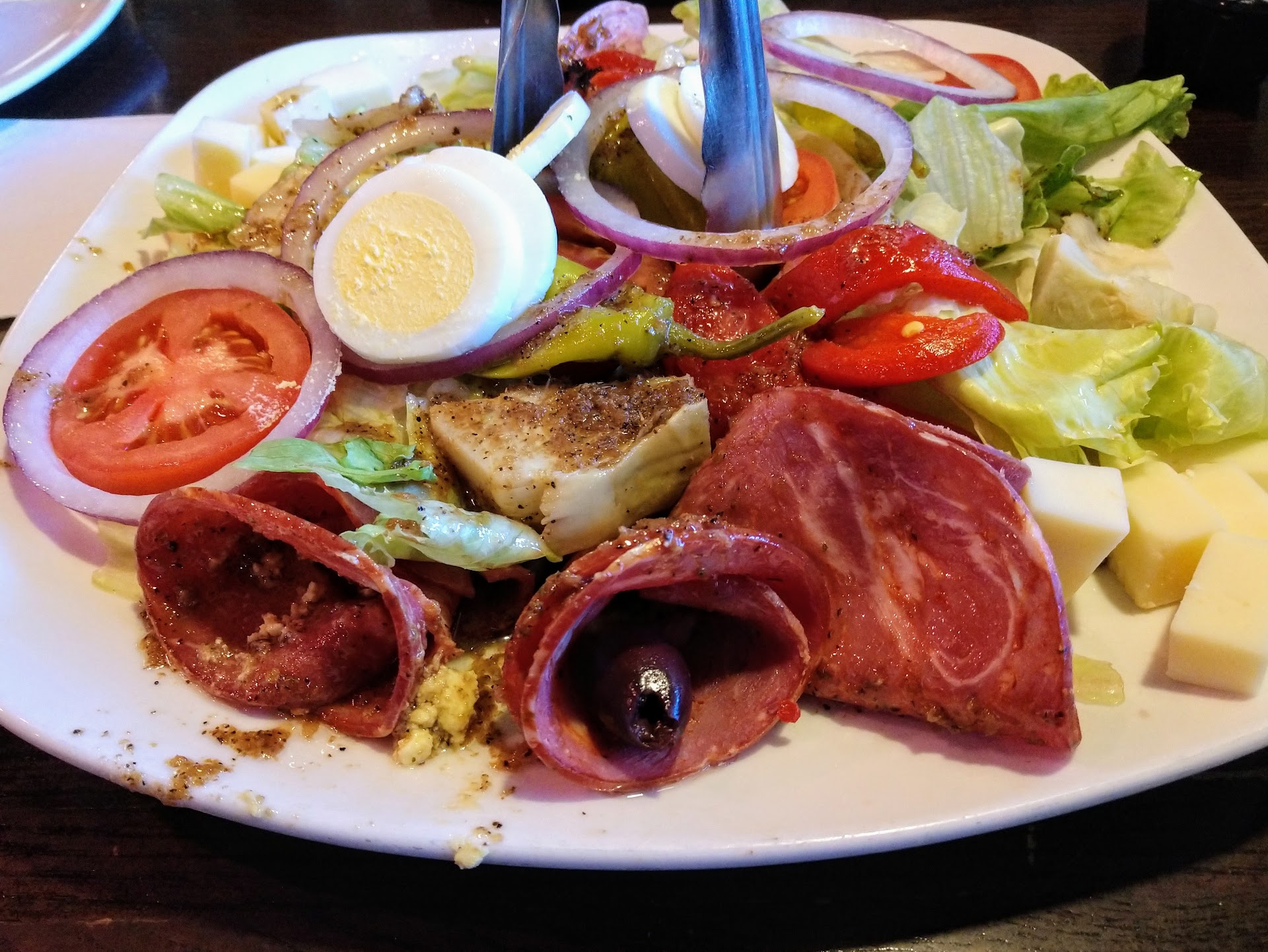 I don't know why we didn't visit this restaurant sooner, but we're happy we ate here tonight. We started by sharing and antipasto salad for two. The ingredients were first rate and the balsamic vinaigrette was delicious. We ate it with some of the complimentary bread and whipped butter. I ordered the 6-oz filet medallions with marsala sauce. It came with angel hair pasta. The steak was cooked as ordered and had a nice char and flavorful seasoning. However, I found the marsala sauce bland and asked for some marinara sauce for the pasta. That was delicious. My wife ordered the flame grilled chicken with a side of sauteed mushrooms. She also enjoyed her meal. The biggest surprise was the desert. We ordered the spumoni tartufo and two spoons. It was outstanding, and definitely large enough to share. It consisted of a ball of chocolate, pistachio, and cherry ice cream surrounded by a hard shell of chocolate, cut into four sections and surrounded by whipped cream, and raspberry and chocolate sauces. It was a wonderful way to end a terrific meal. Our server did an excellent job and the manager stopped by our table to ask how we had enjoyed our meals. Overall, the quality of the food here is excellent and the prices are very reasonable. Will be back soon. UPDATE-1: Returned for another excellent meal. I ordered the 9 oz fillet with a side of pasta and some extra marinara sauce. As I found my first time here, the marinara sauce is excellent. The steak was so tender it almost dissolved in your mouth. And it was cooked medium well as ordered, a good amount of pink but no red. My wife told the manager that the meatballs she had ordered were the best she'd had in a very long time, and the side of a plate-size hunk of broccoli was cooked perfectly. Again we shared and enjoyed the spumoni tartufo for dessert. UPDATE-2: perhaps our third experience at this restaurant suffered from the fact that they were very busy on a New Year's Eve. The service was still excellent, but the food suffered. Our antipasto salad for 2 was mostly lettuce and was missing the promised sliced egg and artichoke. I ordered shrimp scampi with a request for extra garlic. It's possible the order was misinterpreted in the kitchen as a request for less garlic because I could barely detect it. The pasta, shrimp, and spinach were generous and perfectly cooked, but the sauce was a tasteless oil. I ate the shrimp and took the pasta home where I rinsed it in hot water and served it with marinara sauce. I've reduced my rating of the restaurant from...