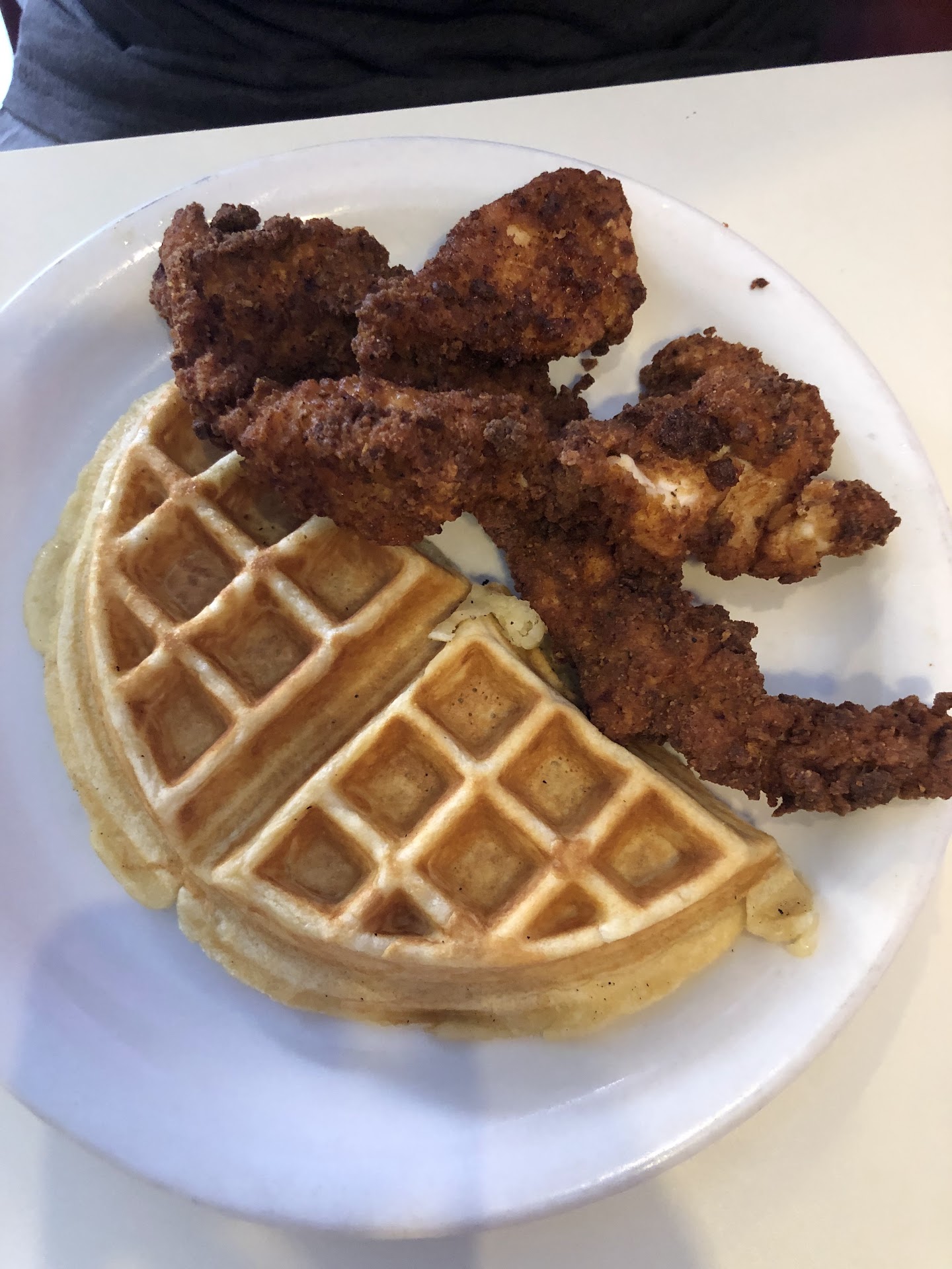 Don't be quick to dump the container of sauce on the waffles. I made the mistake of emptying the contents onto the waffles only to discover that the sauce was a spicy-honey mixture better served with the chicken. Each table has syrup.