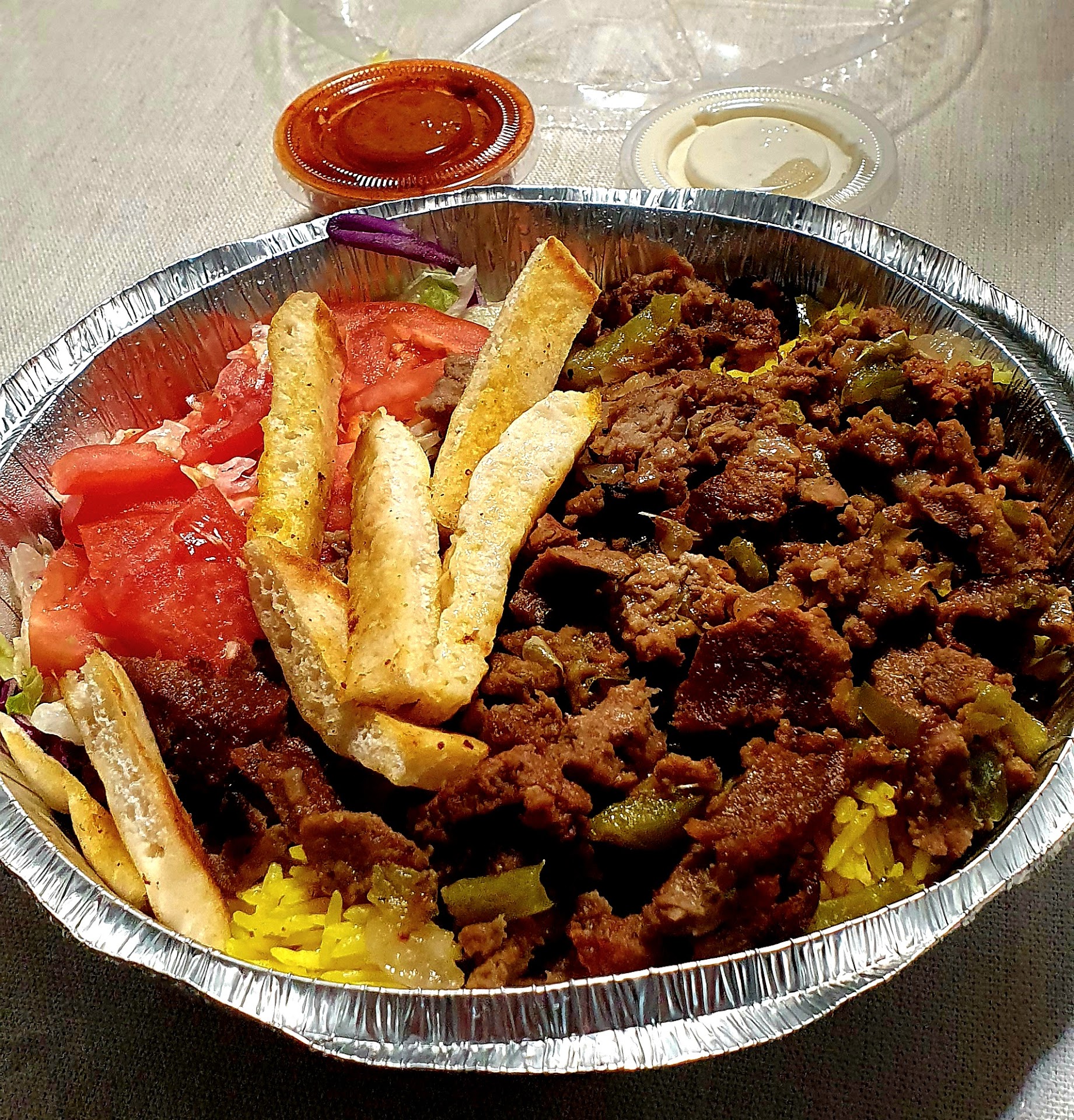 These guys know their menu!!! I ordered the Chicken Plate. Comes with chicken, rice, pita slices, falafel, lettuce, tomato & pickles. The chicken and rice were seasoned perfectly. The chicken was cut finely but was not dry and the flavors really shined. I was asked if I would like āRed Sauceā, āWhite Sauce or both. I chose both. The red sauce had good amount of heat but wasnāt overbearing at all. The white sauce complimented and balanced the heat with some light flavors. I enjoyed the lettuce and pickles to the dish. They added a bit of crunch and sweetness. My next visit I will definitely order an extra side of the falafel. While the inside of the falafel had a nice fluffy texture; the outside was fried to a perfect crisp when you bite into it.