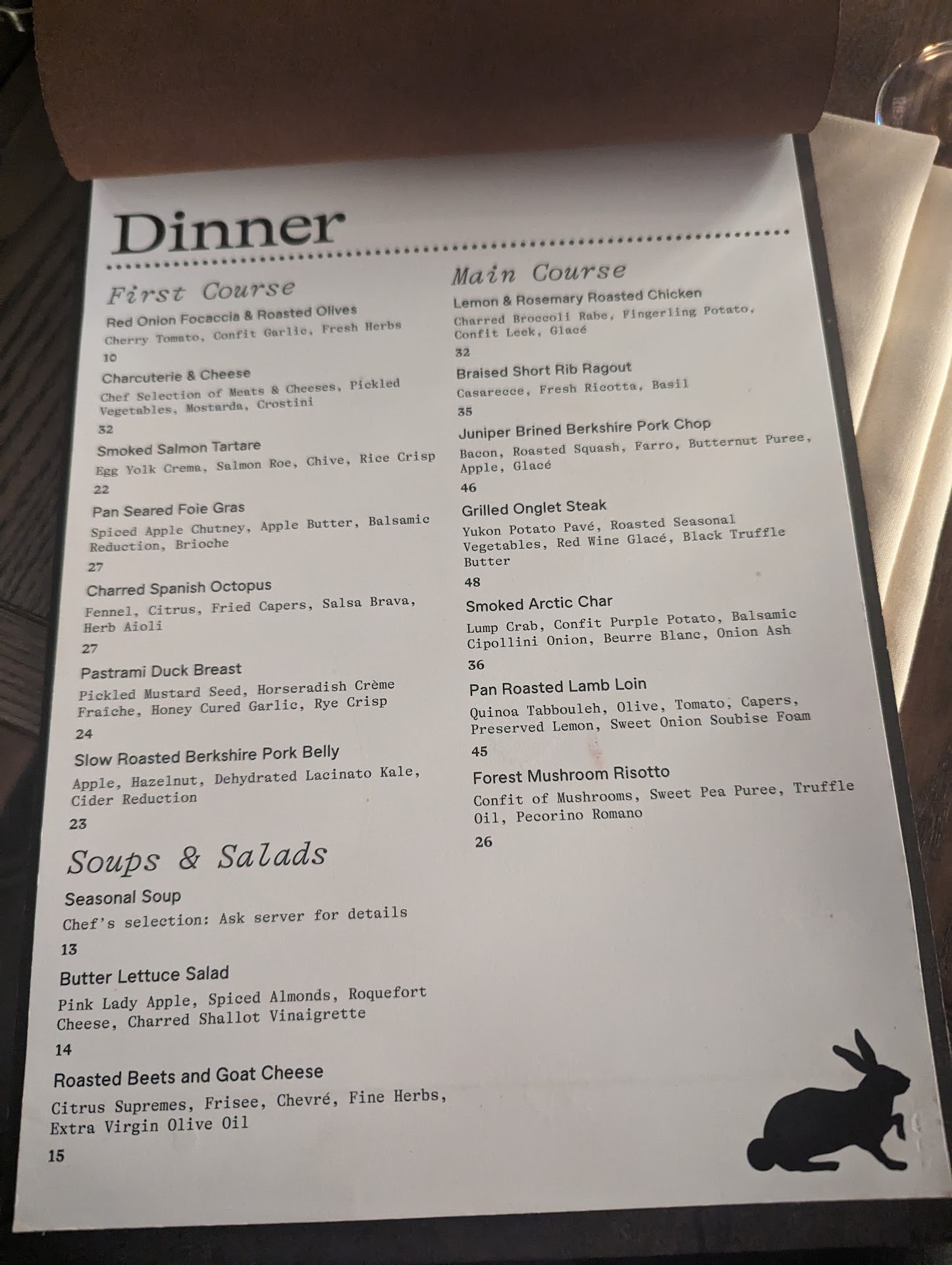 Steak - Our favorite dish. The steak was excellent. The flavor was phenomenal and the sauces complimented without drowning the meat. The potato pavè made this dish shine and was the perfect vessel to wipe up the liquid from the steak bits and sauces. The seasonal root vegetables detracted from the dish, they were haphazardly placed underneath the sliced steak, some were undercooked and the parsnips were very harsh. I don't think a bed of root vegetables are a bad idea conceptually but some work needs to be done here. Or ditch them all together and add another potato pavè. Plate the steak atop two pavès and give the people what they want.