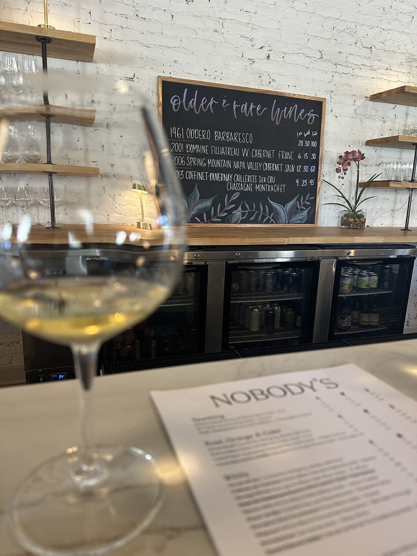 The wine list is clearly very thoughtfully procured, both the BTG and the extensive bottle list, with everything from California Chardonnay to a 1961 Barbaresco poured by the ounce to wines from around the world (Croatia, Slovenia among many other more unexpected/uncommon offerings). I think one of the things I appreciate most is that Nobody's by-the-glass list offers half-glass pours without any markup, enabling customers to try more than just one or two, perfect for those who like exploring wine as we do!