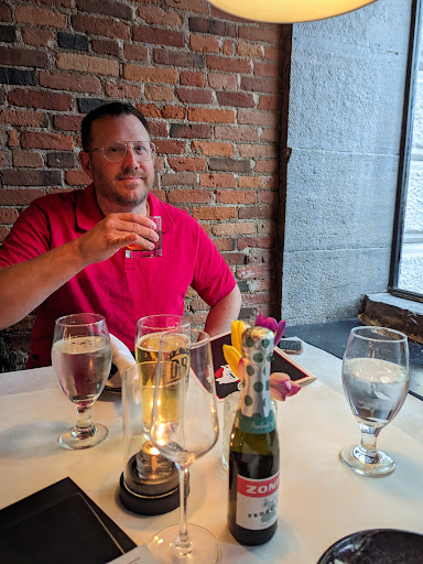 i was mildly confused when our server asked us if we wanted anything to drink (wine) three times. i'm glad she checked because some people may feel anxious to ask for alcohol and giving them the opportunity to order some may help. while that may be the case for others, it is definitely not what we needed. i'm a recovering alcoholic and underage, and the other person (out of three) needed to drive. one person at our table ordered one glass of wine before we ordered appetizers. perhaps she was trying to check on him first and then would double check with us too. i don't hold anything against the server, in fact i wouldn't know how to go about the situation myself if i was a server or manager. not the slightest clue. it's a strange predicament and i don't blame anyone for how it was handled.
