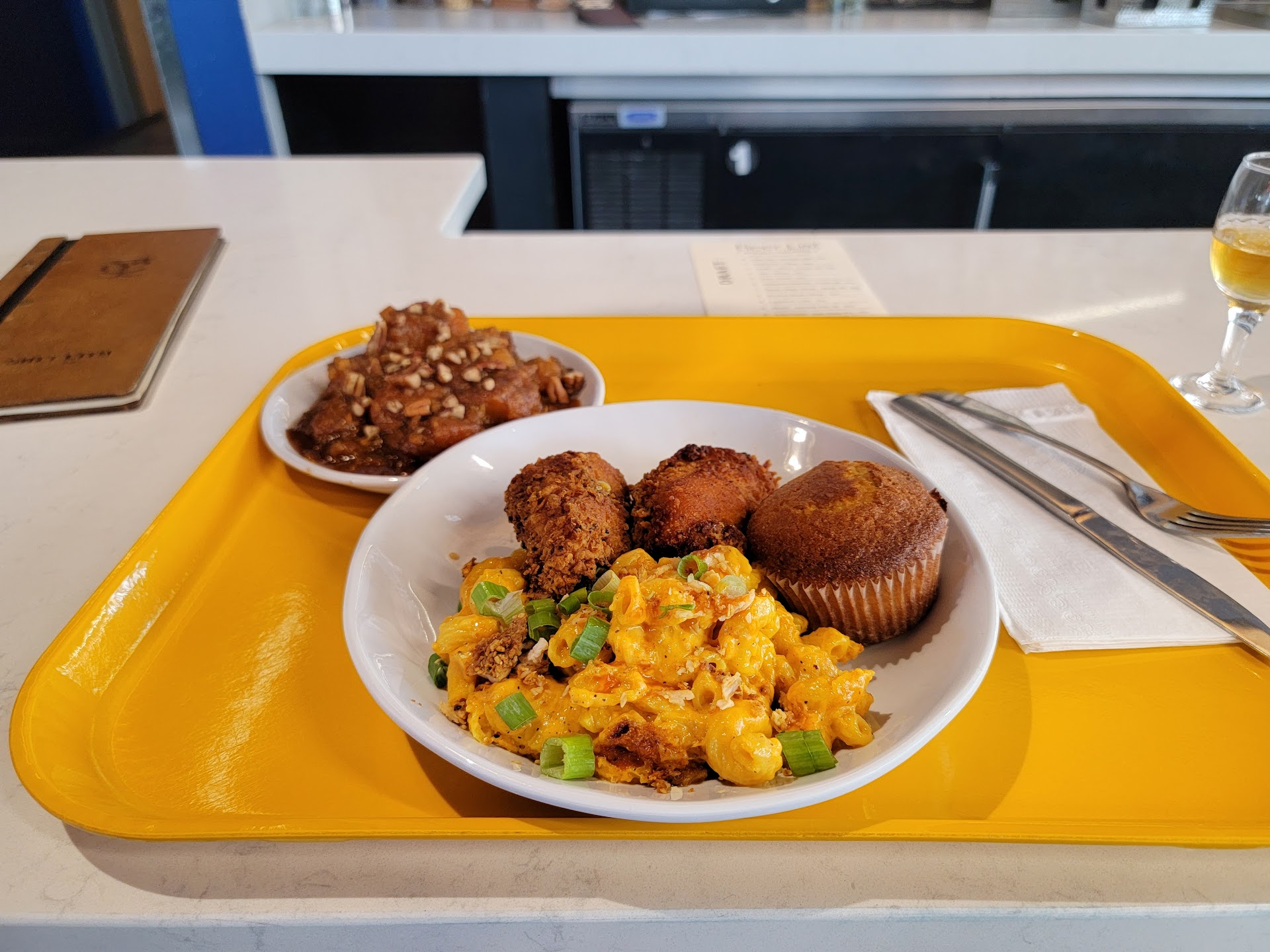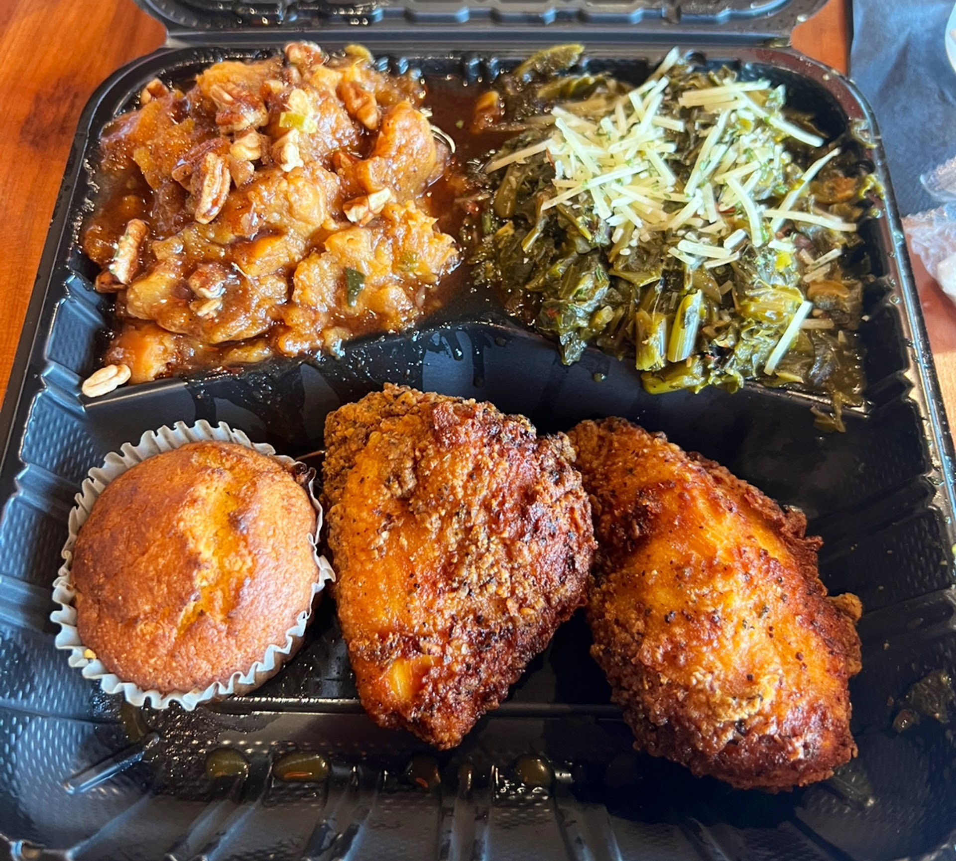 I don’t usually leave reviews—and rarely are they poor, but my experience here calls for words to be said. I came in during a moderately slow time on Friday, there seemed to be a good amount of staff behind the counter. With two people ahead of me and two behind, I watch them receive great service. When it was my time to order the person at the register barely spoke to me or looked me in the eyes. I’m not entitled to their attention, but it was odd considering I had a different impression on how other customers were treated. I ordered the mustard chicken plate with Mac and greens. My food came out 25 min later cold and the chicken was dry as bone. The mac was overly salted and didn’t even taste like Mac. The collard greens were extremely sour. The cornbread crumbled to sand. I’ve ordered here before with my partner and had similar taste issues with the food. Will...