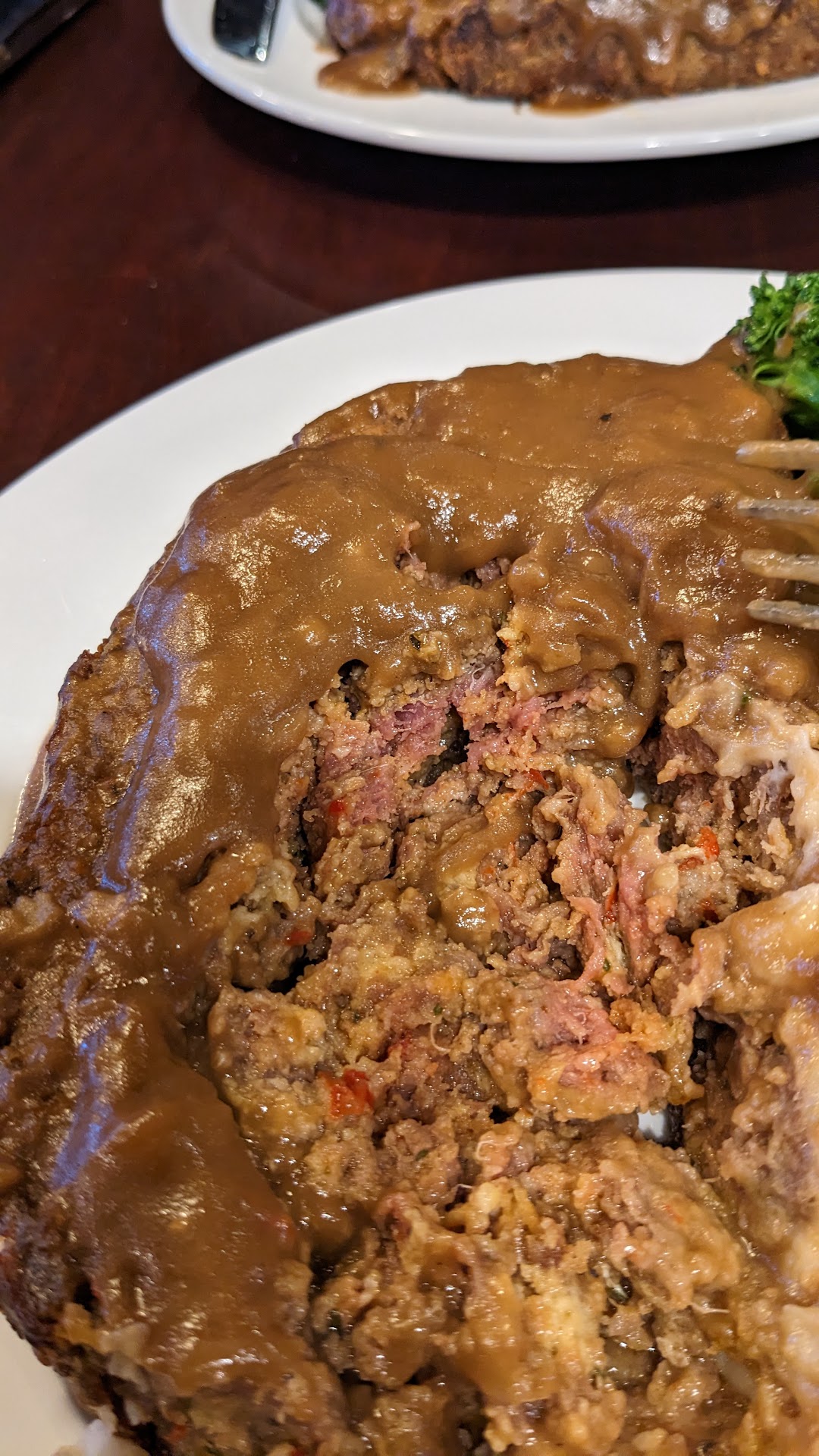 I took a few bites, starting on the edge and working my way in. The edge of my meatloaf, I noticed was kind of burnt, but I didn't want to make a fuss. Then I noticed that the meat wasn't firm like other meatloaves that I had eaten before. The meat started look a bit too pink for my comfort. I think it was after my third, albeit hesitant, bite that I inspected the center and noticed the redness of the red meat staring back at me. When I asked my sister if the meatloaf looked raw to her, she confirmed my suspicion. We showed Keri who responded with grace and remedied the situation.