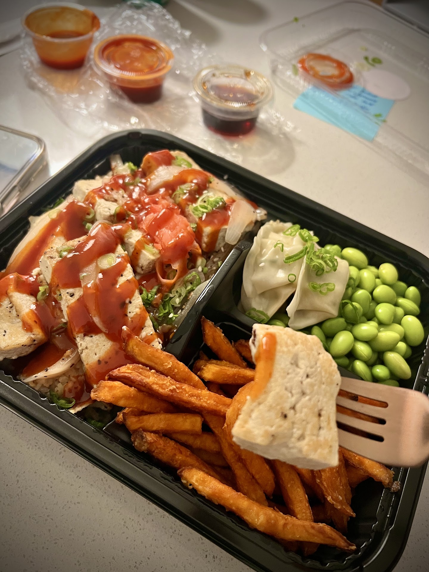 Upon arrival, there was a handwritten note stating that the teriyaki sauce was also not vegan (as it has Worcestershire sauce in it) so that was also left out so it was basically just pan-fried tofu. The saving grace of the meal was that I happened to also order gochujang sauce on the side and used that to flavor up the tofu. The Japanese BBQ sauce I ordered also had Worcestershire sauce in it so that was left out the order but was charged for it as well.
