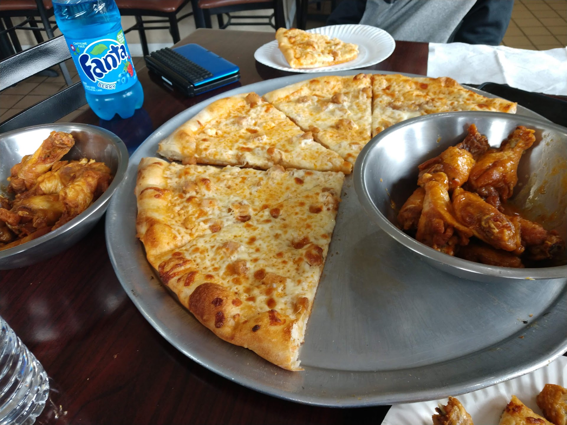 Pizza was very delicious. But definitely could have been quicker with their service. We waited at the drive thru so long (with no service) I finally pulled up and went in and still had to wait just to be acknowledged that someone would wait on me... With people just walking around in the back finally the pizza guy yelled up and asked me if he could help me... Hey probably closer to 15/20 minutes to get 2 slices warmed up and in a box...if I wasn't driving a person (diabetic) that needed to eat I would have left... Being busy I would understand but when you're not I find it hard to excuse poor customer service. I'm giving 5 stars to the food and to the...