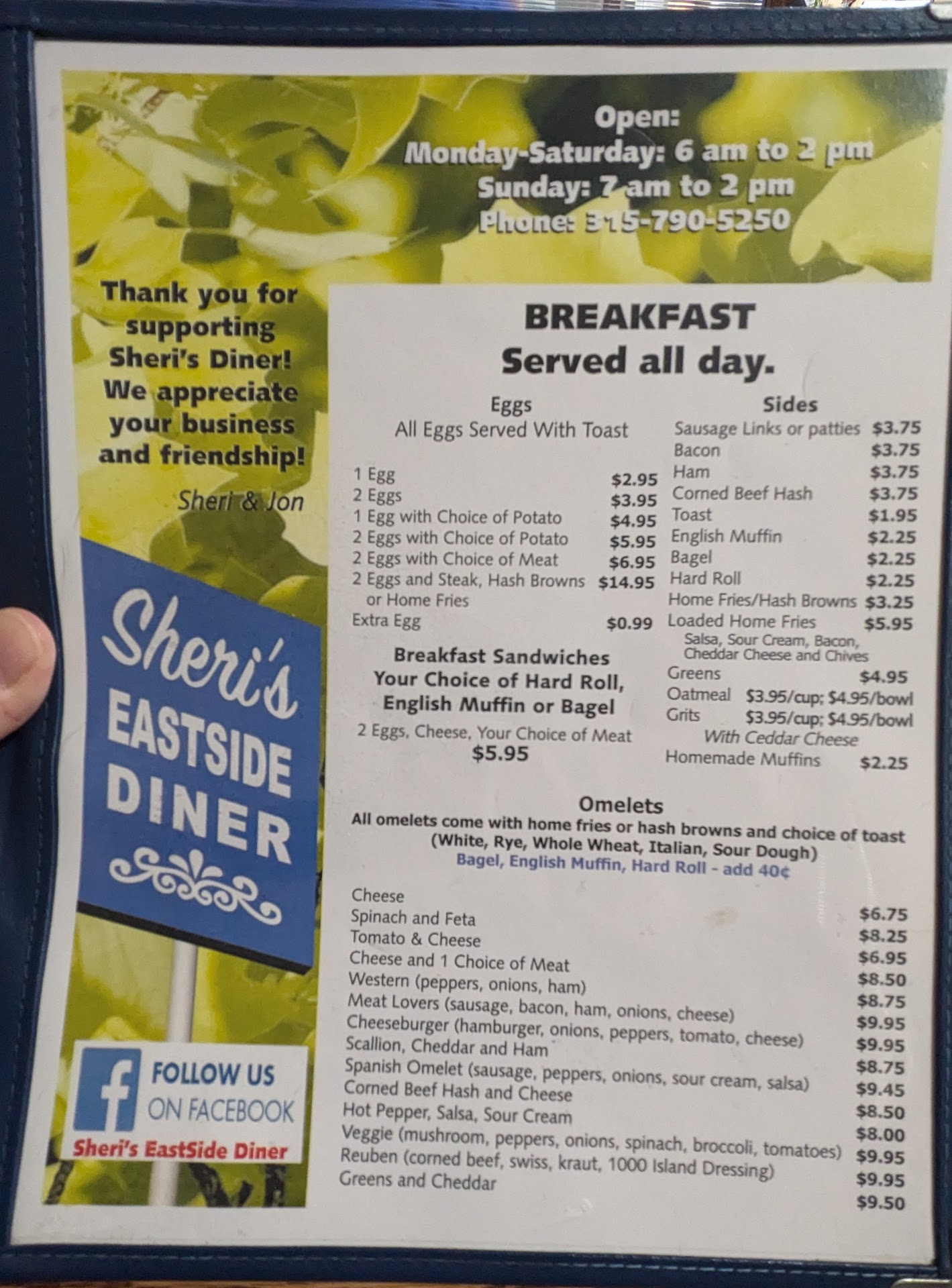 Attempted to support local business and eat a local diner. Sheri's was NOT it. Initially, it seemed pleasant enough, not too busy, and the namesake, Sheri, who was part waiter, cashier, and part cook seemed pleasant enough. My brother and I started with dinner coffee and after about 15 minutes placed our orders for a 6 egg omelette and a French toast meal.
