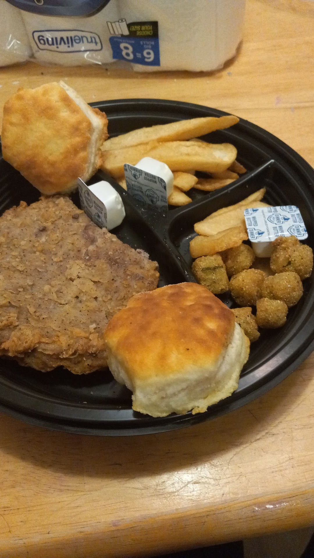 The food was excellent. They actually sell Impossible Sausage for vegetarians. That was very cool for my spouse. He had the sausage, egg biscuits Benedict with hash casserole and fried apples. Very tasty! The hollandaise sauce was unfortunately slopped over the edge of the plate and pooling on the table. I had the new Cheesy Bacon Homestyle Fried Chicken with broccoli, pinto beans, and corn muffins. So yummy! Hot, fresh and looking exactly like the photo lol.
