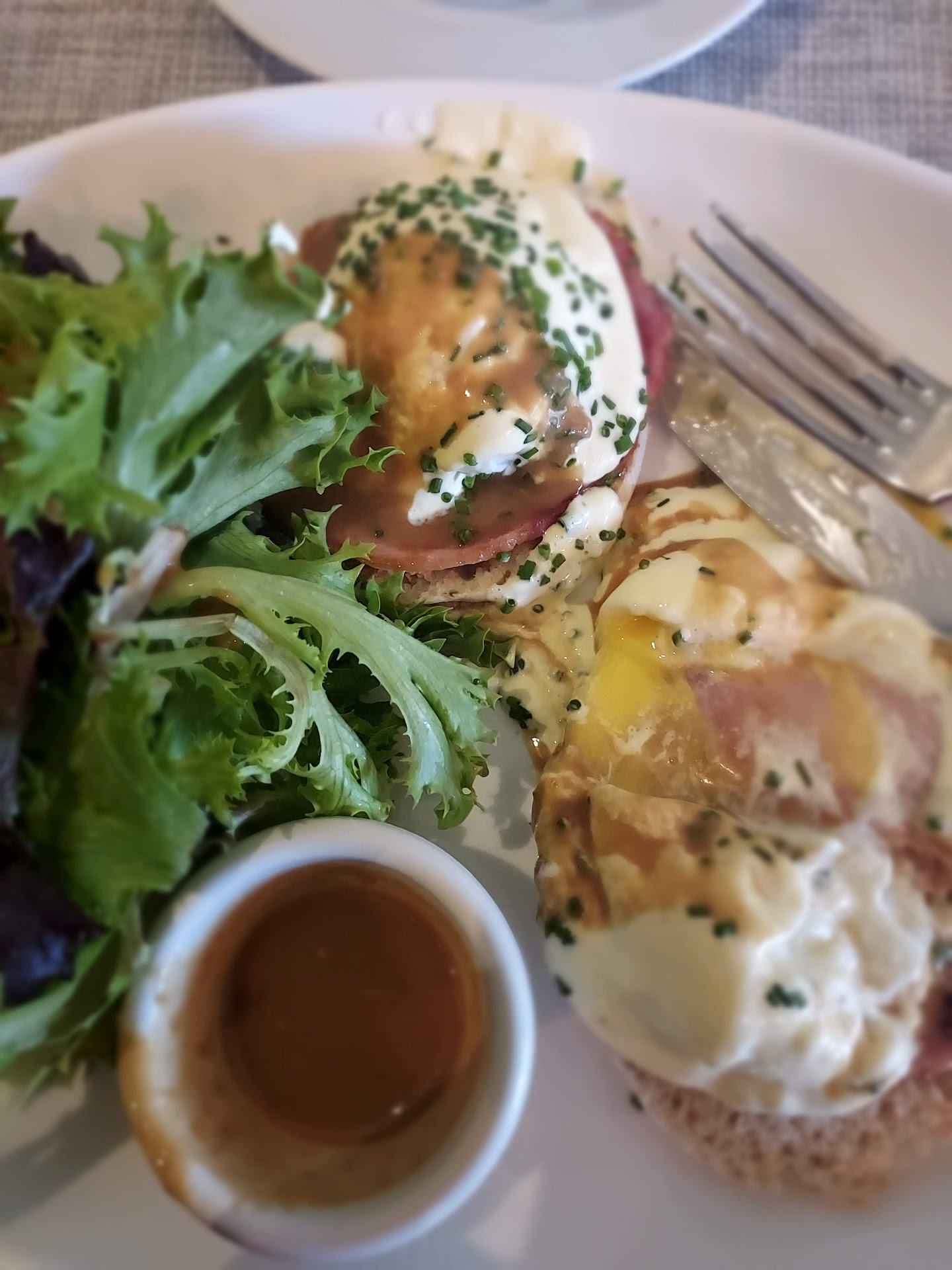 While staying in Water Town NY and after googling resturants who served breakfast we decided to try out the Eatery on Main street in Tarrytown. It seems like egg Benedict is a popular staple for breakfast menus. The resturant is small inside but offers a outdoor seating area in the front. The menu items are all offered throughout the day. The menu offers tea for 1 or 2 people. I was in the mood to try out the eggs Benedict which also came with a tender green salad and dressing. Delicious! The hollandaise sauce was delicious and the two eggs were cooked right the muffin the eggs were served with was in between a English muffin and toast. I ordered a nice coffee which came with creme. Excellent. My husband chose the egg hash entree which was served with mashed beats. He said it was 5 star worthy and he recommends the dish. The server was efficient. The resturant only has one small bath room which is unisex and customers need to go behind the counter to get to it. The resturant...