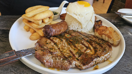 The ribeye (medium rare as pictured) is your generously-sized meat-and-potatoes entree, seasoned with a south American twist and served with four kinds of protein, plus rice and fries … all on the same plate. It even comes with perfectly cooked ripe plantains, alongside an incredible cup of chimichurri that elevates everything it touches.