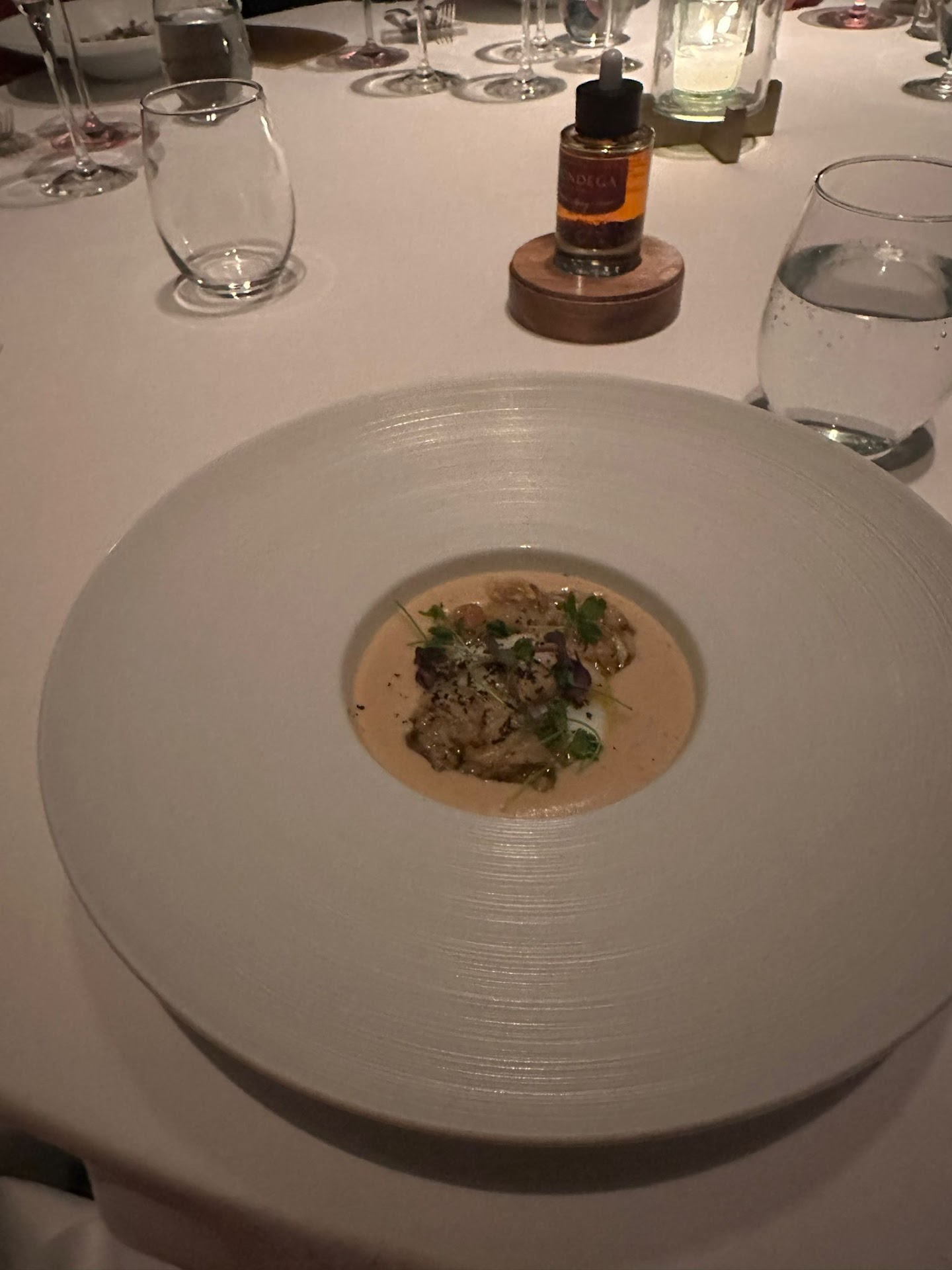 The next course they brought was one shrimp laying on top of its open shell. Arroz De Gambas. Andreia brought over some spicy oil drops and suggested we put a drop or two on the shrimp. The texture of my shrimp was soft, almost mushy (for lack of a better word) it took me by surprise. The spicy oil added both heat and flavor that I enjoyed.