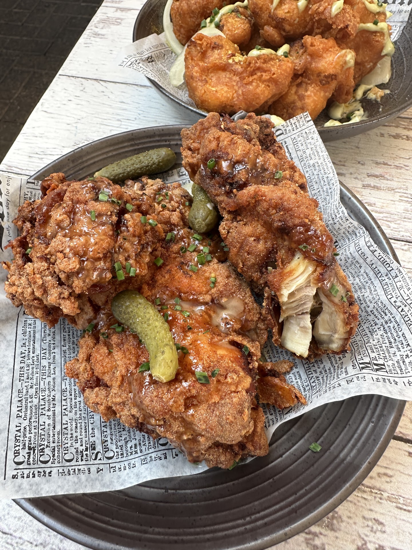 Fried chicken was a bit in the drier side, it was also pretty bland and could use some salt and a bit more other seasoning, but the breading was crispy. The “hot” honey was not hot at all. I’m actually very sensitive to “heat spice” and this had no heat.