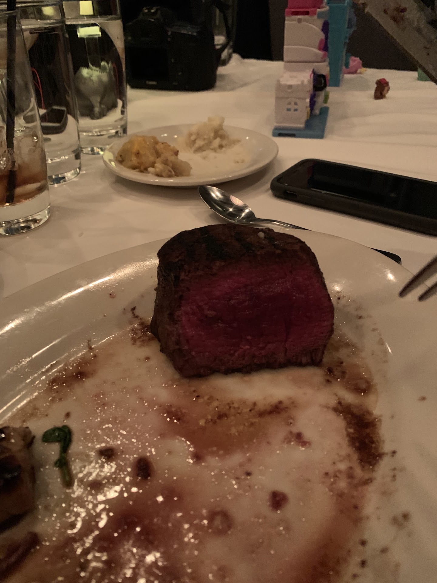 I also failed to mention that they forgot a side of asparagus . After alerting the wait staff when the food came out and we noticed it was missing, it took 30 minutes for asparagus... yes 30 minutes for asparagus. After the 25 minute mark I told them to keep the steak it wasn’t worth bringing out since everyone else was done with their meal by at least 10 minutes. The person next to me received their steak, but instead of being medium as ordered it was rare. Took a picture which is below. 30 minutes and they couldn’t get it right.