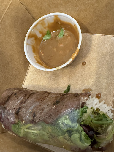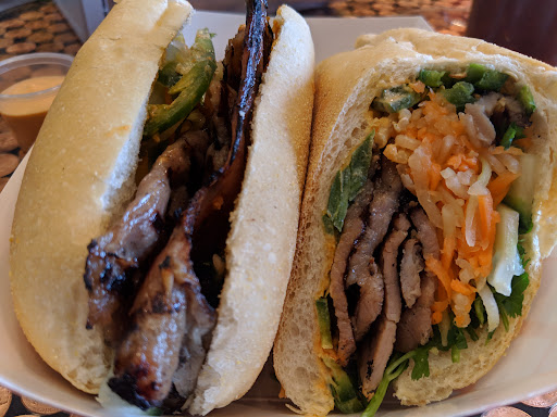 I ordered the marinated sliced pork bĂĄnh mĂŹ, and when it came, it felt almost too simple: a brown paper box, a neatly tucked sandwich, the smell of grilled meat and pickled vegetables rising into the warm, cluttered air. The bite was everything at once â crispy bread, juicy pork, the briny snap of pickled carrots. It wasnât exactly a traditional bĂĄnh mĂŹ â the flavor leaned more toward a Texan barbecue sandwich, thick and smoky â but somehow it worked. It was hearty, straightforward, like the shop itself. Less Saigon street cart, more American dream whispered through a cracked kitchen window.