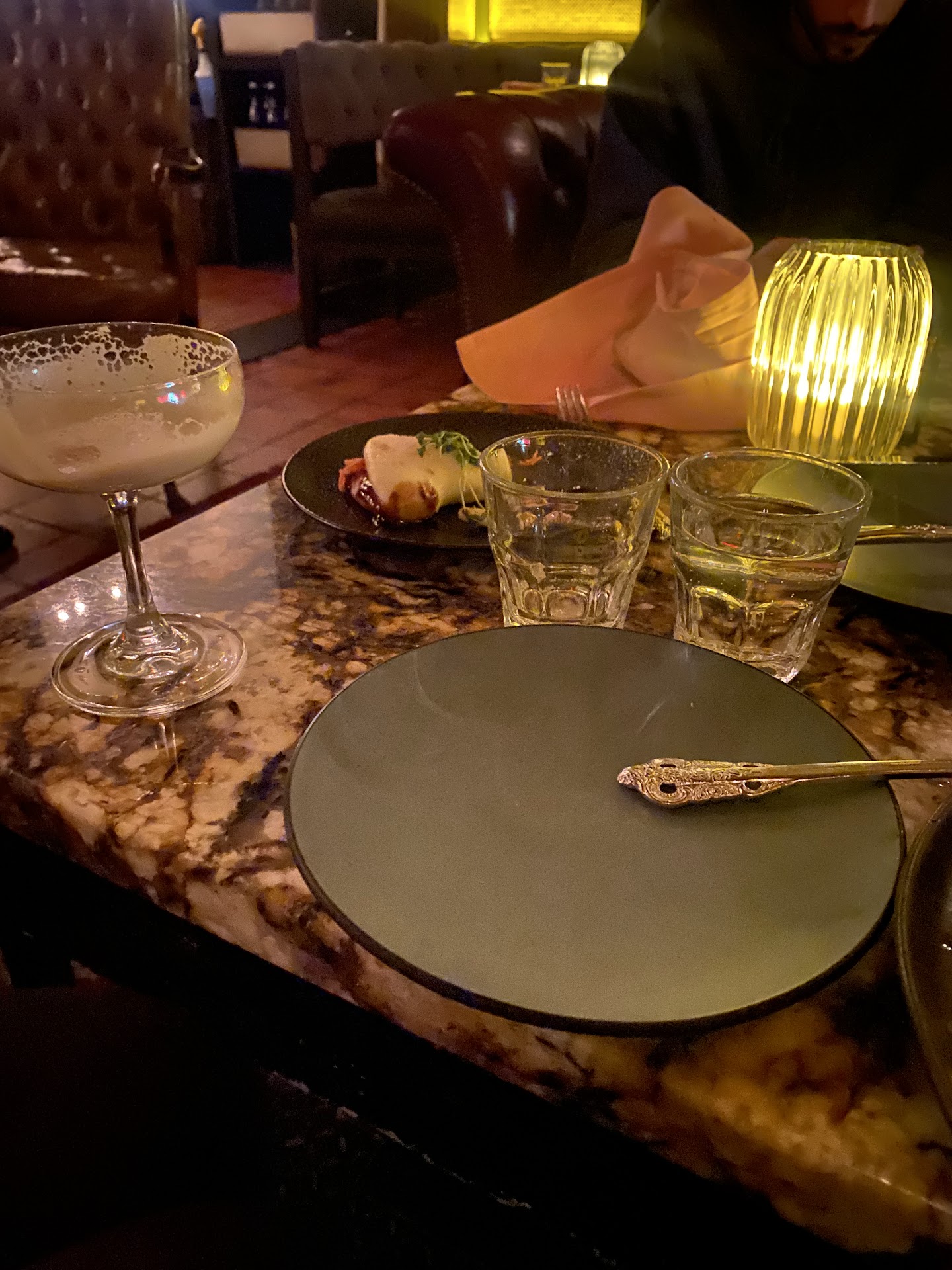 Read moreFirst of all, the vibe here is really cool. Itâs dark and moody and low lit and feels like a cool, hidden gem of a place. The intrigue ends there though. The hostess seated us at this tiny 2 person table smooshed into a corner between a huge booth and next to 2 other 2 seater tables. One side is booth seating and the other is a tiny chair thatâs not comfortable and makes you feel squished in. The feeling is very much that theyâre trying to fit as many people as possible in this small establishment, at the cost of comfort. My fiance had made reservations and specified that it was for my birthday. But they sat us at this shitty little spot. There was a better table open, but we couldnât get it cuz another couple was coming in and they were to be seated thereâŠso much for making it a special occasion. We could barely have our own conversation because we were hearing everything the people to either side of us was saying. It was very loud.