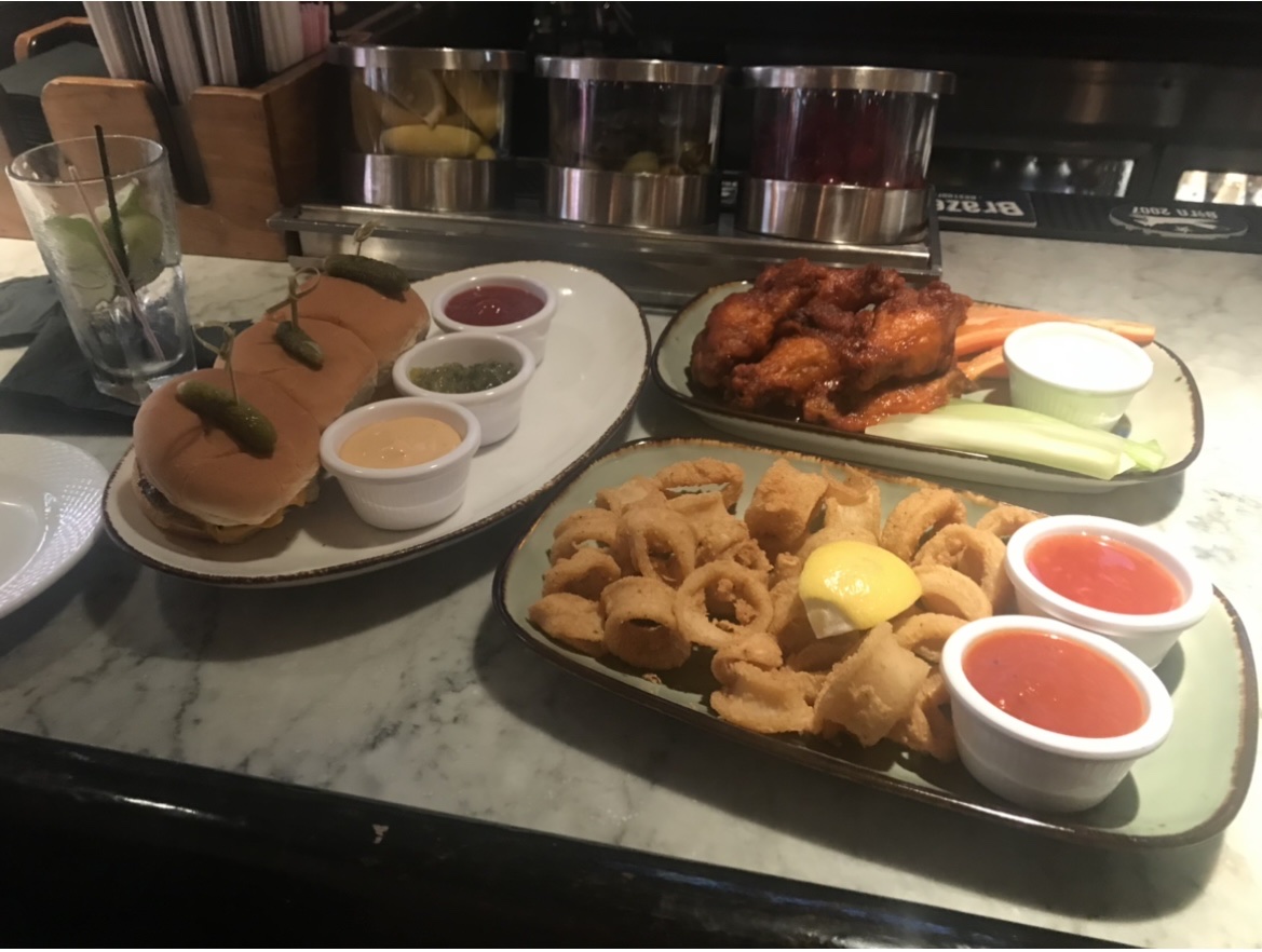 We had the calamari, sweet potato fries, guacamole, salsa and chips, pear & gargonzola cheese pizza, Brussels sprouts, grilled cheese w/ mashed potatoes and I think that's it. Ask of those items w/the exception of the grilled cheese and mashed potatoes are all part of the $5 happy hour menu!
