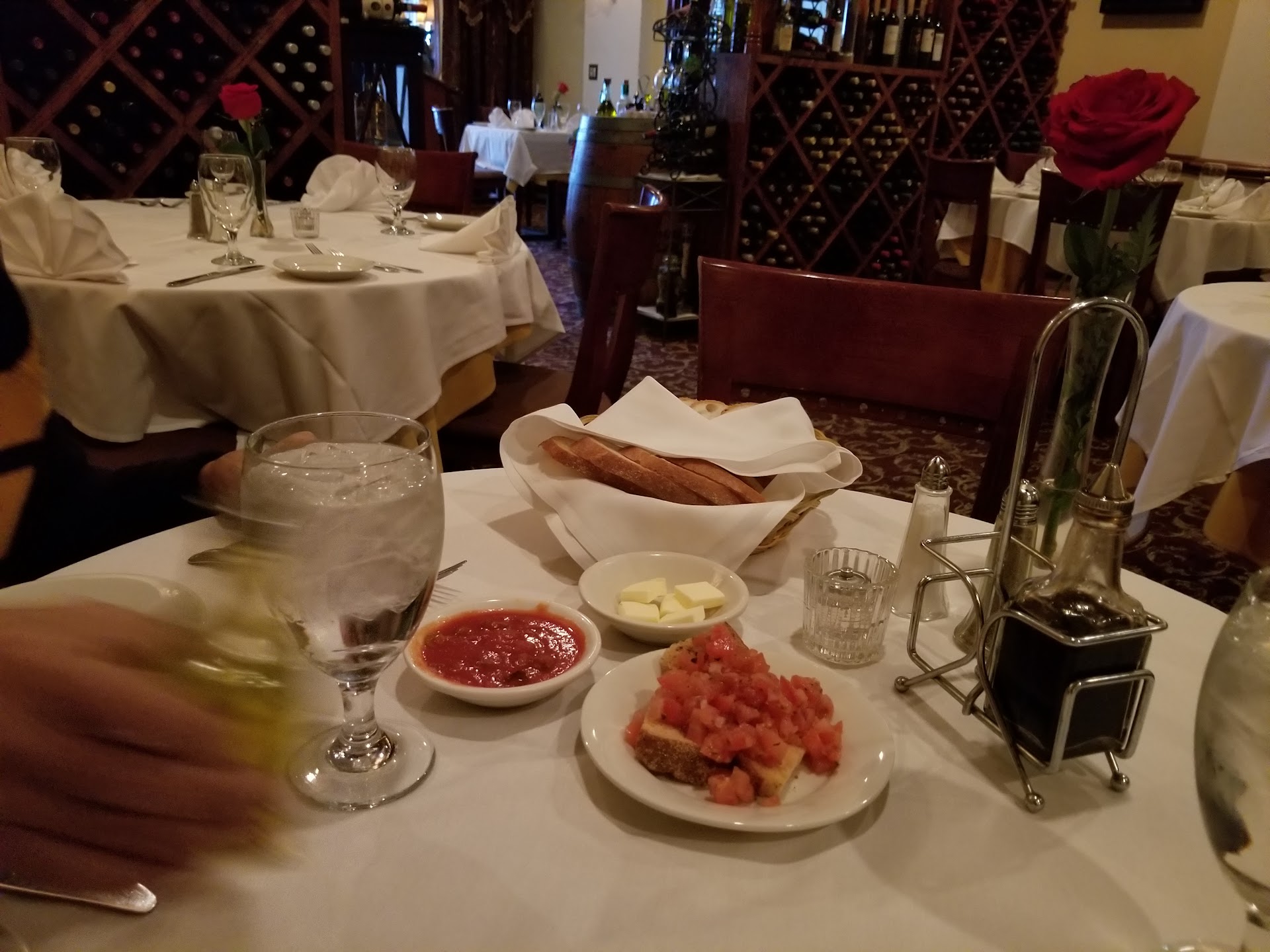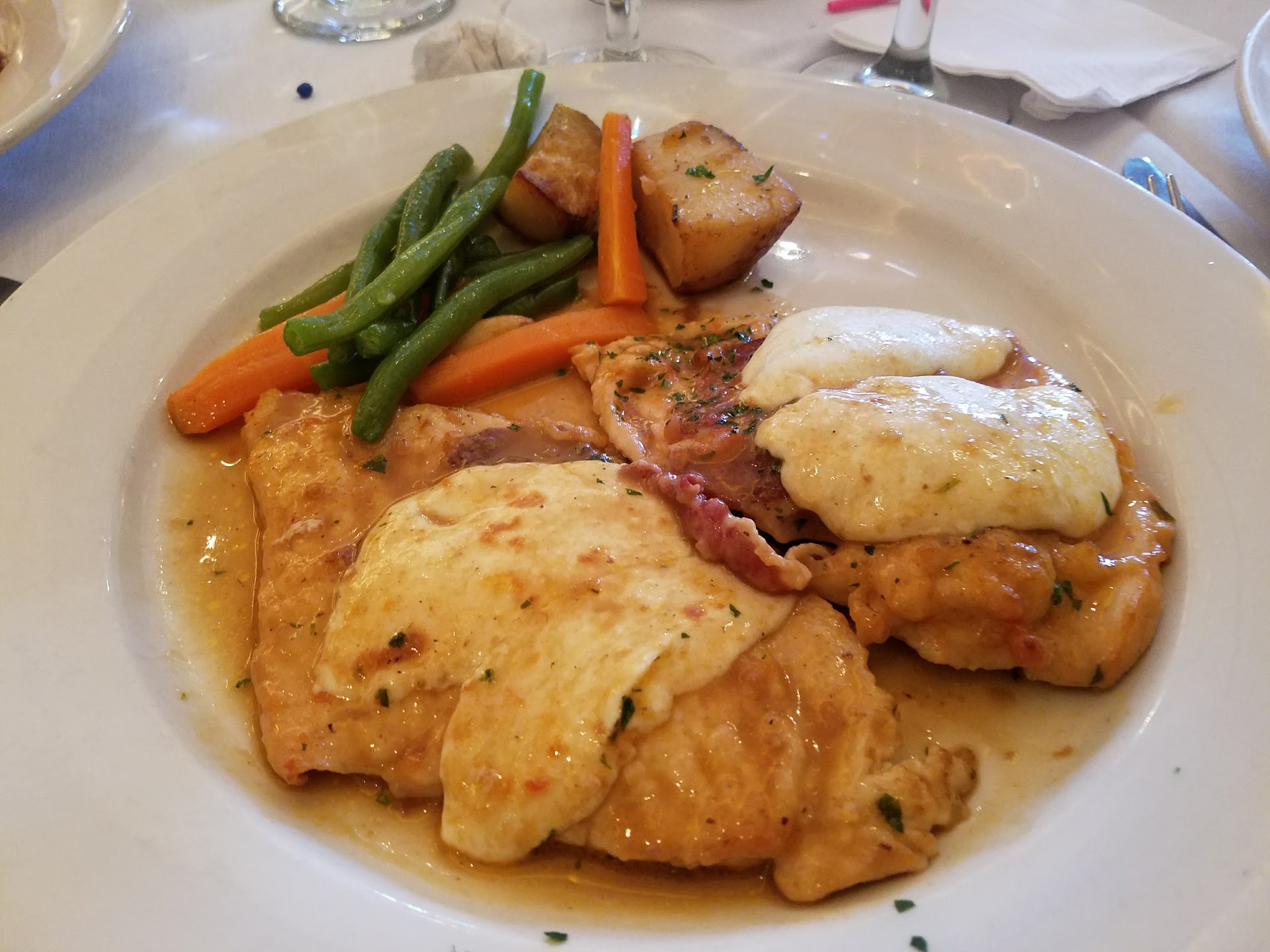 We stopped here because we happened to be in the area & passed by. We were welcomed from stepping into the restaurant, seated & ordered. The water was continually refilled as soon as it hit half of glass & the food was delicious. We had fried Calamari; they were nicely crispy & the sauce was good. When they bring you bread to the table they have the regular bread plus 3 pieces of crunchy toast w/bruschetta. Delicious & there's butter plus a cold italian sauce that has chopped zucchini in it. That was really good too. They give you olive oil as well with balsamic vinegar and we got minced garlic. For dinner hubby had Sea Bass fish that had onions, olives & capers. It came with string beans & carrots with potatoes. They weren't seasoned but I enjoyed them. The fish was so soft & flaky but without the toppings it didnt have much flavor so they could have put much more. I had the chicken with italian ham & melted mozzarella cheese. Delicious. We each also got an order of capellini with red sauce. Everything was very good. For dessert we split a creme brulee. It was a bit burnt but still good. I highly recommend this restaurant for the staff ti the food. We will ho back for sure when...