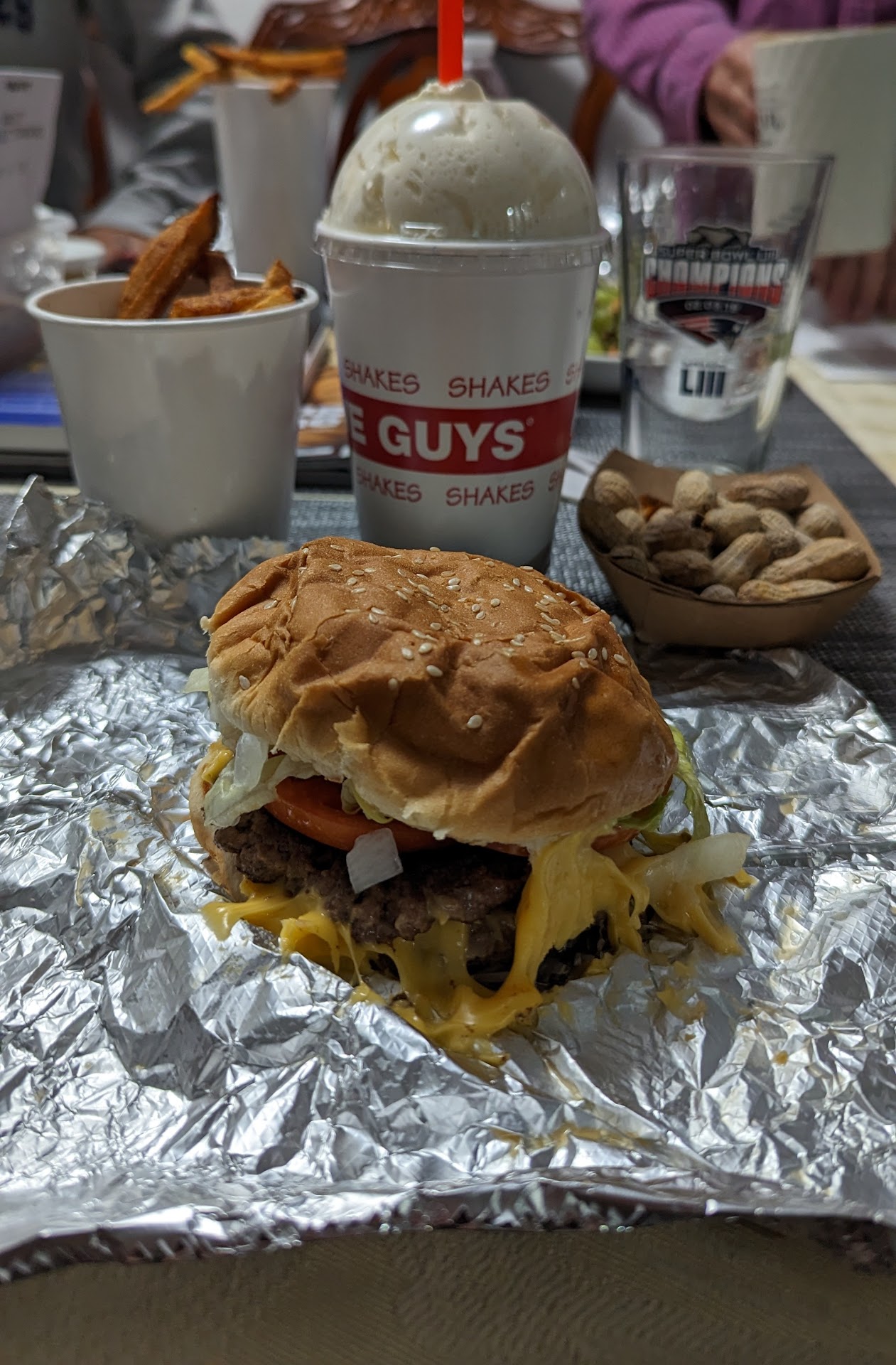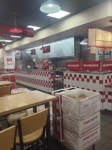 I haven't been to this location prior to this. We went there to get 5 large orders of fries. Anyone who knows Five guys, knows that their large fries are huge. My husband came home with TWO bags of fries (keep in mind that we ordered 5 large and they normally come in their own bag or the most, two to a bag). I opened one bag and saw that there were 4 cups of fries in there, not overflowing and the other bag, I pulled out one cup of fries that was literally half empty. I asked my husband if he had eaten any of the fries and he said no. I ended up pouring the fries in one container and it wasn't even enough to feed 6 people. This may sound unreasonable, however 3 weeks ago, we went to a Five Guys and bought 4 large fries (they each come in their own bag with fries overflowing) and it fed 3 families (a total of 6 adults, 2 teens, 4 children 5-12 years, 3 children 2-4, and a 1 year old). We still had so many fries left over as well. So it was disappointing to see that we paid $40.23 for 5 large fries that were probably more like the size of regular fries and not worth the money. I assume that this is because they may not get as much traffic as other Five Guys due to the location so they try to save in that area. Either way.... this is what Five Guys is known for.... Great burgers, and great fries with generous servings.... and the peanuts, of course. Haha. I will just travel the extra miles to go to Cross County...
