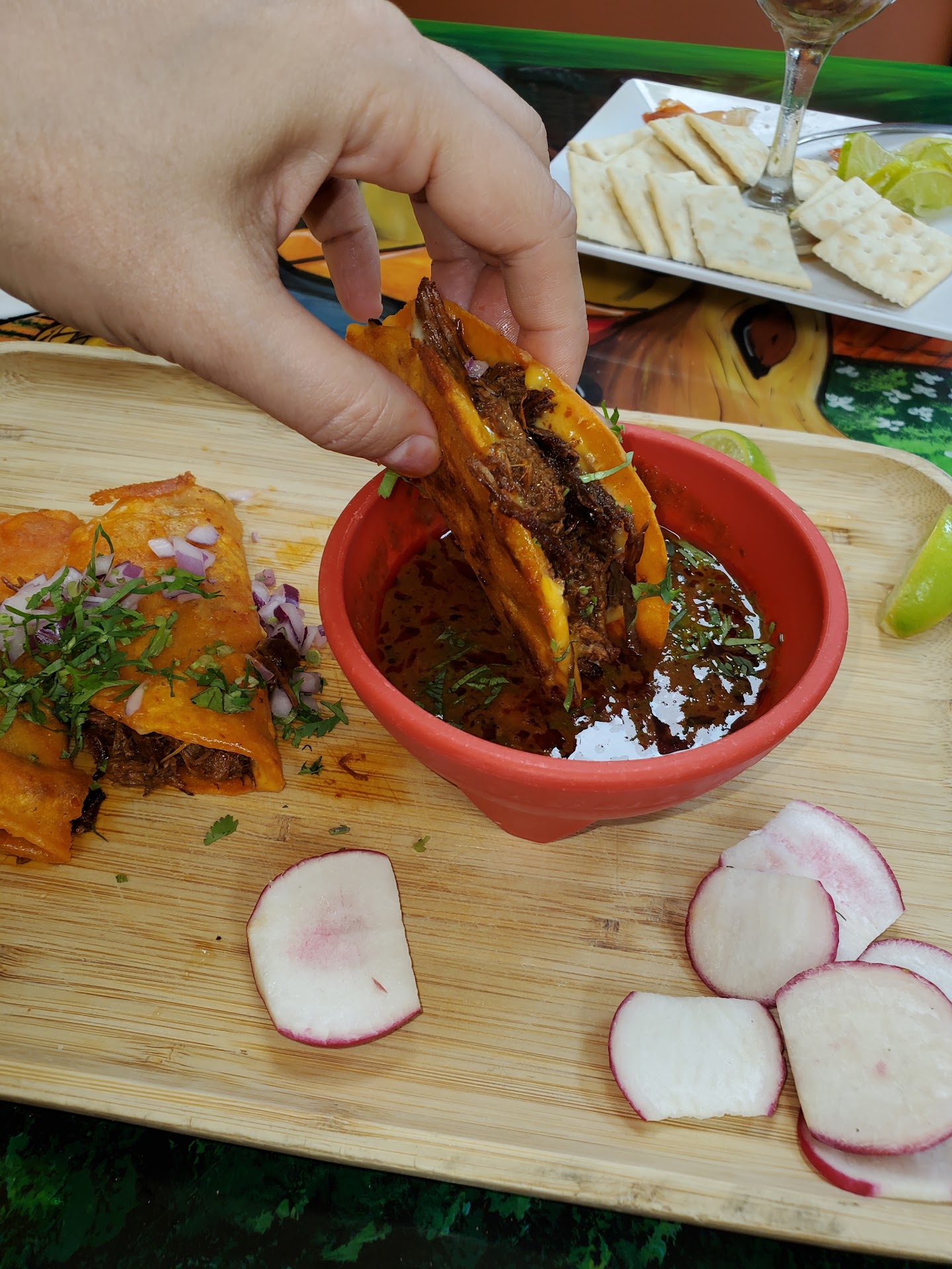 Read moreThe food was ok at best. Came here because I was told the Birria was good. It lacked the depth of flavor that Margaritas up the road from this spot has. They do use it in creative ways like a quesadilla, torta and ramen. I wouldn't recommend it though. I also had a gripe with the kids mozzarella my daughter ordered. They were greasy, without any marinara and not gooey like a mozzarella stick should had been. I asked for this dish to be taken back and was told that they wouldn't take it back and I either had to take the loss or pack it to take home. Most other places I've been to would have replaced it. There was only one server working on a Sunday and we waited 30 minutes after having fished our meals to receive our bill. After paying and leaving a cash tip on the table, I looked at my bill to see that 18% gratuity was automatically included. Apparently in the fine print of the menu there's a disclaimer that 18% gratuity will be automatically on all indoor dining. Places like this take away any need for good service, that's why we waited 30 minutes to check out and couldn't return unwanted food. Don't go to this place if you want service. They...