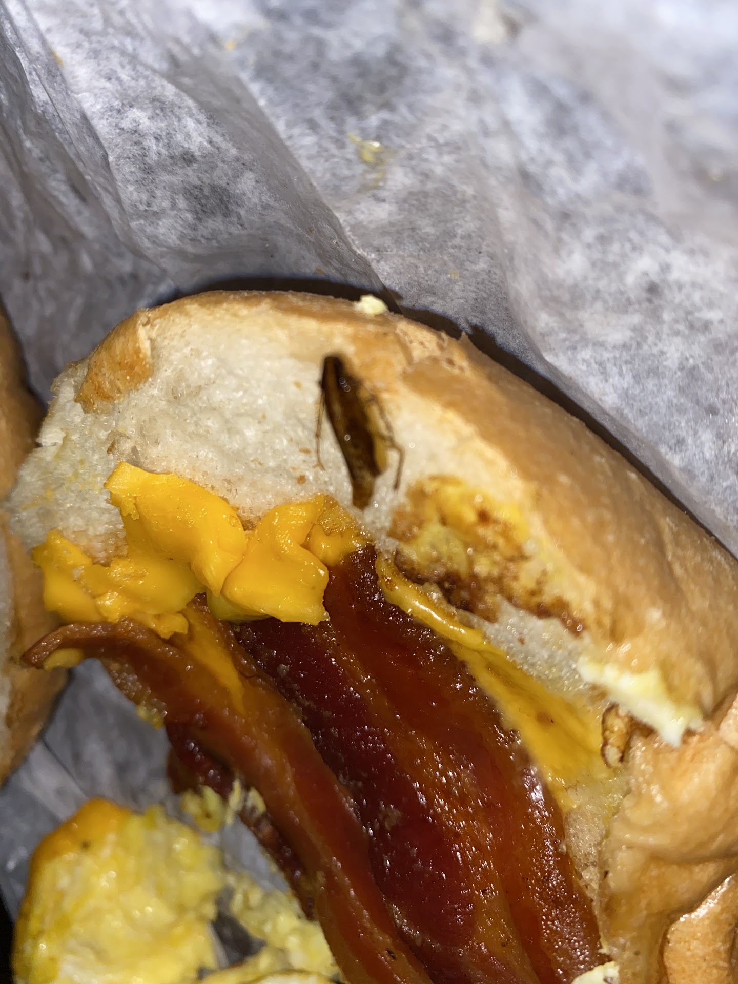 I did not want to write this review because I used to love ordering food from here. And the delivery driver has always been the nicest and quickest. I ordered a bacon egg and cheese and when I opened it I noticed there was green scallions or green peppers mixed in with my scrambled eggs so Iām trying to pick them out then I look at my bacon to see this black thing pick it up and this is exactly what I get. It was so hard like it was fried with the bacon as if theyāre leaving it out.