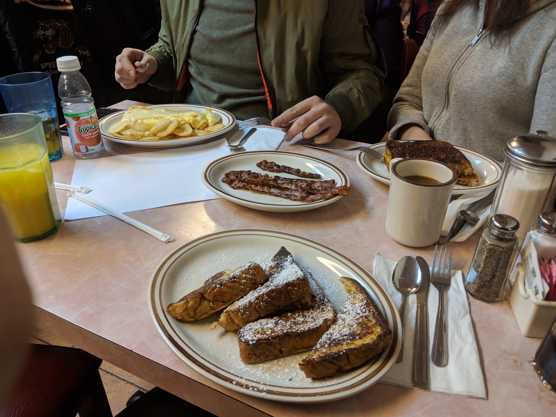 I ordered a cheese omelette with fries it came with a piece of bacon which was so good. I decided to get that with a bagel instead of toast, a side of bacon and an order of French toast. Everything was cooked perfectly, the bacon came out a bit too crispy so they remade it for me without a problem. The hash brown/potatoes and pancakes were also amazingly good!