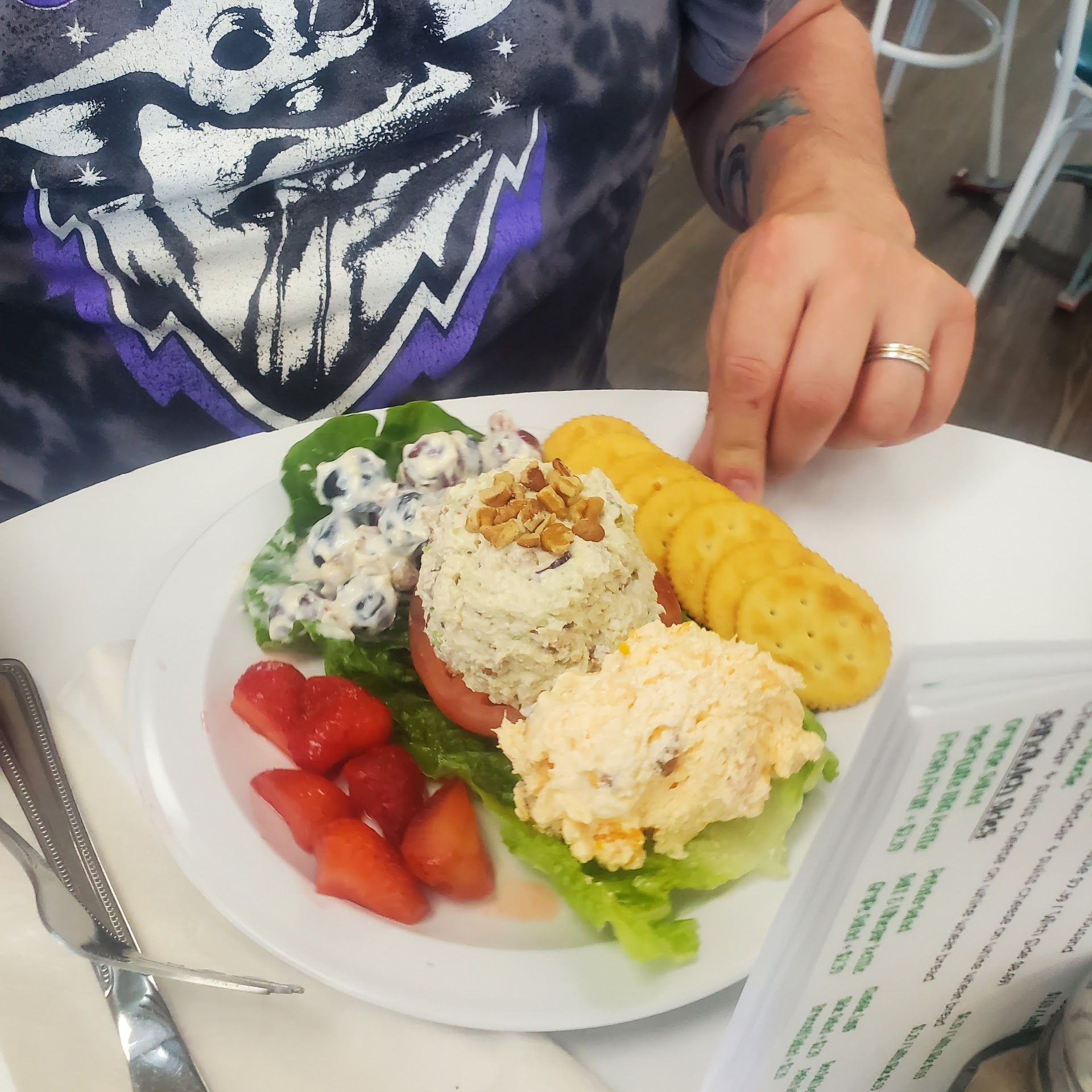 I finally got a chance to check this place out, after reading the reviews I decided to come in for lunch. The menu wasn’t huge, but it was enough. They offered cold salad plates, deli sandwiches, TV and hot sandwiches. You can be seated, and they would wait on you or you could order at the counter for ice cream, chocolates, or to go orders. I ordered the trio salad, and some water to drink. The homemade chicken, pecan salad, was good, but you could tell the chicken was put in a food processor because it was very fine and not chunky at all. There was some pecans in it but very small pieces. It tasted good nothing spectacular about it. I also got the tuna salad and it was good, it had pickles on it and also dill weed I believe. It was also good and very fine as well . The broccoli salad was very good in a small cup with Very sweet dressing, and it also had lots of sunflower seeds. That was probably my favorite. It was all laid on one big crisp piece of romaine lettuce leaf and one slice of tomato. It also came with a few Ritz crackers. For a lunch that was less than $10, it was worth it. I ate every bite. All of the chocolates and sweets, fudge and the ice cream all look very good. Because it was a pecan farm store, they offered pecan meal, chopped pecans, whole pecans, with different sizes available. I did notice a 1 pound bag, that seemed very expensive to me. But I really don’t know what to expect. The store was decorated nicely and also had a big variety of different kinds of gifts, mainly , geared towards a woman , of course. I had asked one of the employees if they had any crosses for sale anywhere. She said she didn’t know, because she didn’t do the inventory…… There was a small section for men, they also had an upstairs area that had discounted items and items on consignment. When I returned downstairs, I had decided to get an ice cream cone and made a couple of other purchases. The ice cream was very good and the waffle cone was very fresh. I I enjoyed my lunch, browsing around, my purchases and the ice cream. I would recommend...