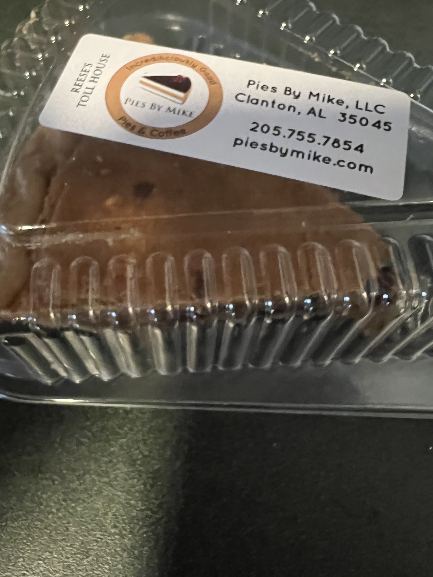 Read moreMy sister was driving from Detroit to Mobile, Al and near Clanton saw the sign on I65 for Pies By Mike. Thank goodness she did because now, no one in my family passes the exit without stopping and bringing pie home for everyone. They sell a large, changing variety of whole pies and pie slices. You can call ahead and if your favorite wouldn’t be on the menu they will make it. They close early but that doesn’t matter. They have a kind of pie vending machine room so after hours you can pick up one you ordered. Didn’t order one- there are extra slices and wholes in the case. Don’t miss this delicious pie shop. Pictured below a slice of Reese’s Tollhouse and a (once)...