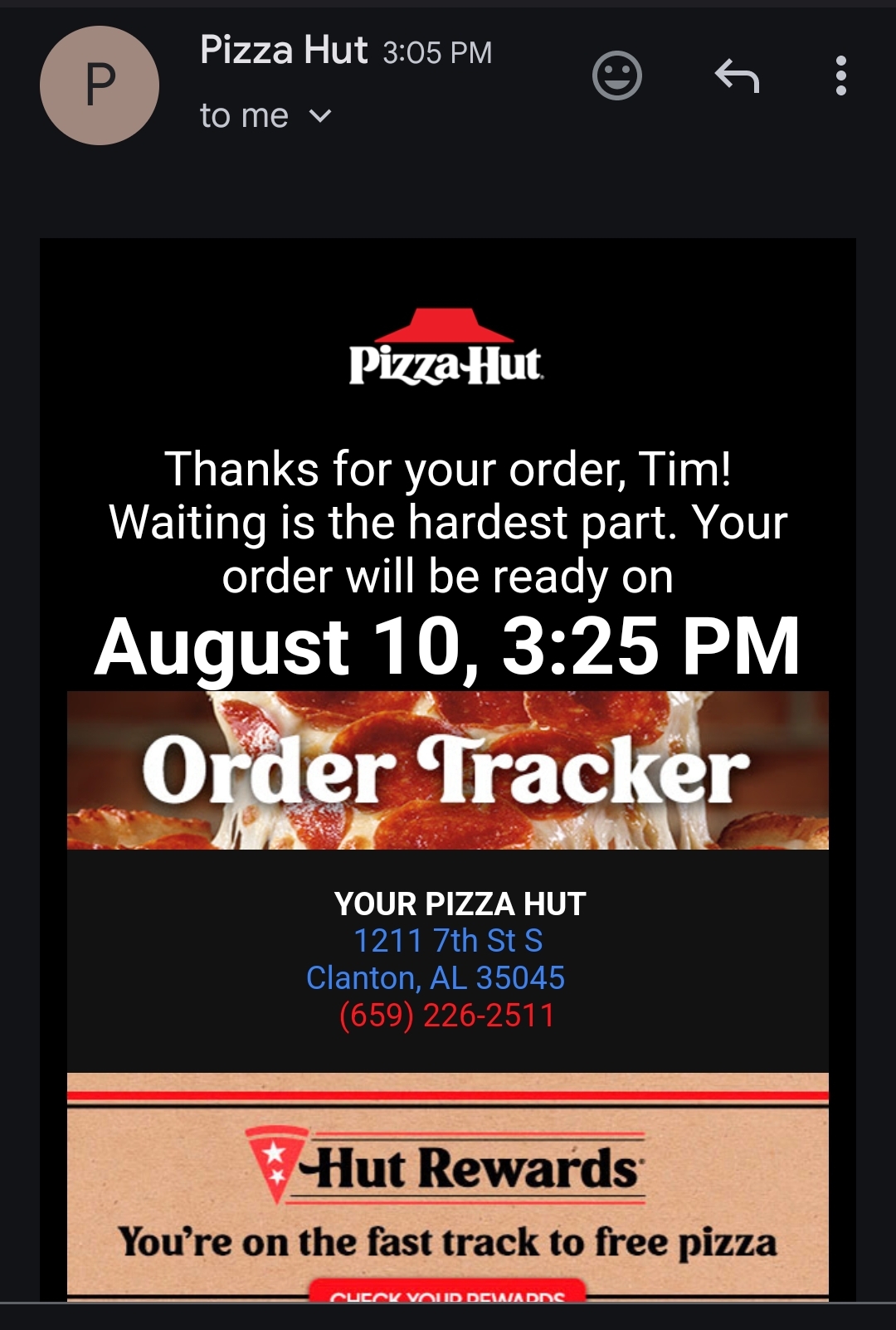 Read moreTrying out new pizza Hut in clanton. This will be my first trip and my last trip. First off, it was very hot inside which makes for miserable dine in experience. Second, the lady at register had no clue how to use register. The manager was in a booth on her cell phone. Lady at register made 3 trips to booth to ask how to ring up our one pizza order. All 3 trips the manager never got off her phone, and seemed perturbed that she was being asked for help. Again: never got off her phone. After the 3rd trip, lady and register finally got it right after many failed attempts. If you open a business I think you should have trained employees. If you manage a business, you need to get off your phone and go to register when there's a problem. Horrible...