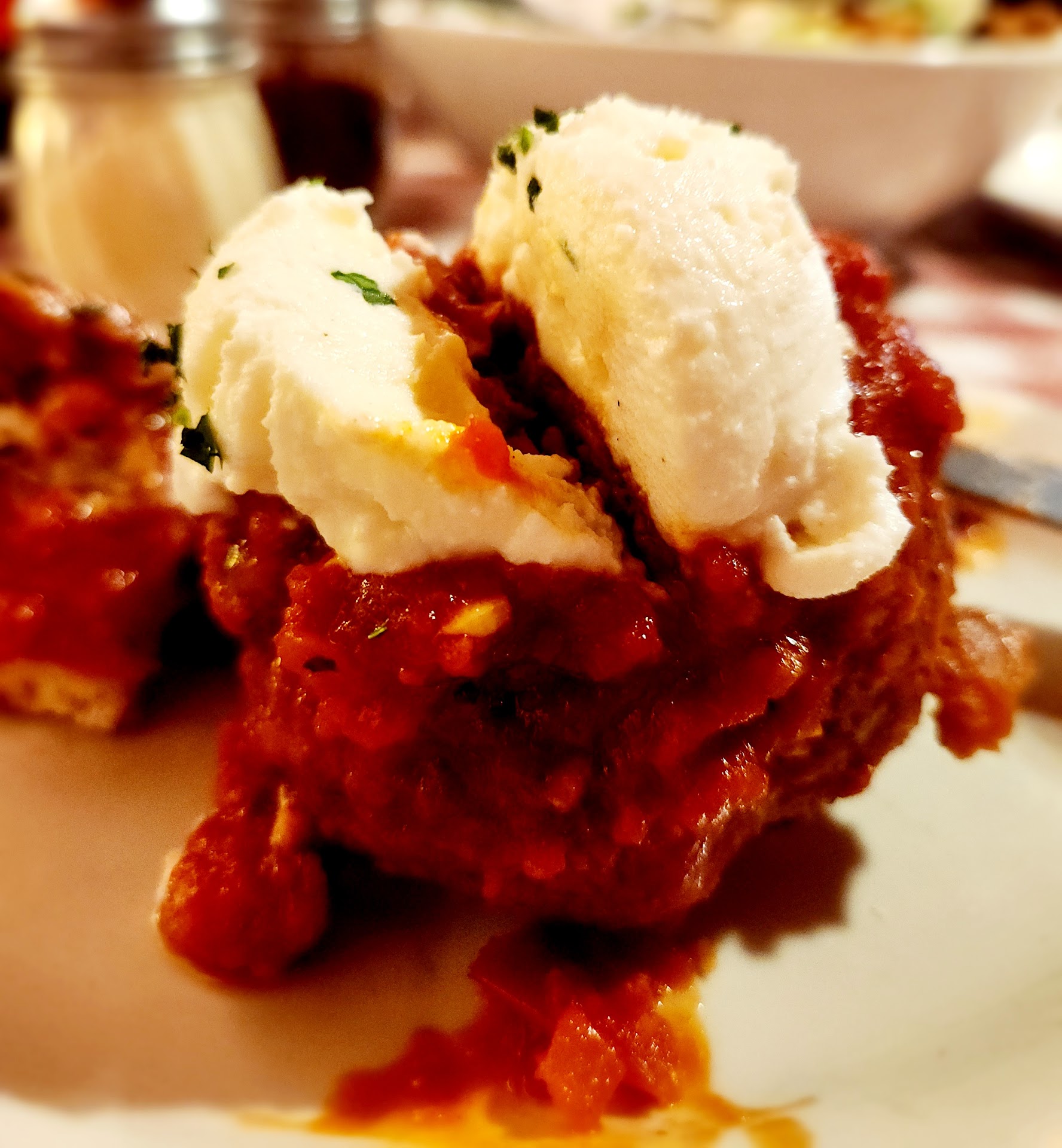 PROS: Friendly service from Red. She did an adequate job. Plates and silverware took a moment to get to us. Refills were infrequent, but present. Garlic cheese bread came out crispy and cheesy, but not very garlicky. The house bread arrived soft and warm with a decent quality olive oil. They dressed the gorgonzola and apple salad evenly, but needed more cheese. The world famous meatballs came out juicy, large, and pretty tasty. The marina sauce that accompanied it was good for dipping the garlic cheese bread. The spaghetti and meat possessed a rich and hearty flavor. The chicken cannoloni pasta seemed too firm and flavorless. The stuffed chicken with proscuitto won for best taste of the entrees. The crispy breaded breasts with salty proscuitto and mozzarella cheese with pesto sauce combined for a mouth watering flavor. Red made sure our cheesecake had the extra toasted hazelnuts which ended the meal nicely.