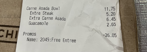 Read moreTake in mind that I went a little after 7 pm. And that a full like of 5 customers showed up after me. They did not have all the options of protein ready and were not organized. There were 2 employees (including the manager) just walking around the dining area. The girl that made my order didn't know how to use the cashier at all and had to call the manager. Which had difficulty processing my chipotle scans I had that day. And even after scanning all that he assumed that I was given my order without checking, I had to wait for him to notice I wasn't leaving without my order. Which was incomplete when he finally gave it to me.