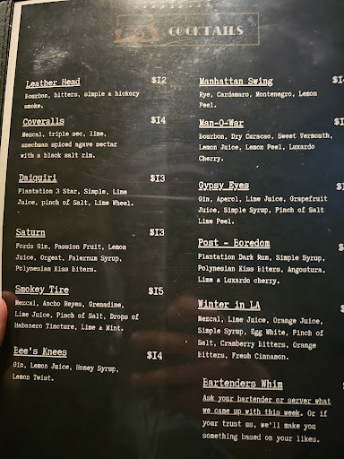 Read moreFirst let me say this place has a fun concept, from the way you enter at the front door to the atmosphere once inside to the sweet little whiskey room downstairs. Where they run into problems is the quality of food and the high prices. We were a party of 5 with a reservation. We were seated at a table with a couch on one side and 2 chairs on the other. Sitting on the couch and reaching the table was very awkward, hence it made eating and drinking uncomfortable. There were few if any drinks under $15 and the dinners were $30 plus for entrees, unless you wanted a burger. I feel these prices are quite high for Claremont. Maybe in a big city, but not Claremont. All of the servings of French fries at our table arrived cool, not hot, and I was told that they had run out of scallops as the rest of my friends were being served their dinners. This after being told they had run out of Filet. And it was a Saturday night. They did comp my meal when it finally arrived and we had a wonderful time after dinner in the downstairs whiskey bar. The bartender down there was exceptional. I really wanted to...