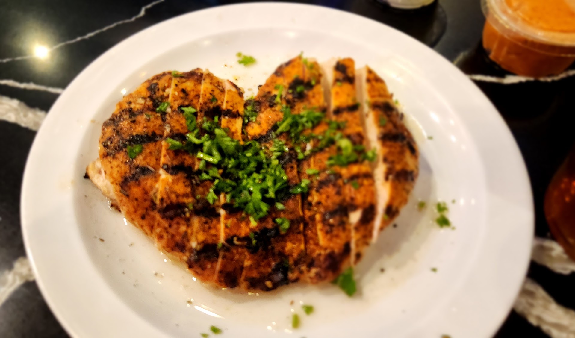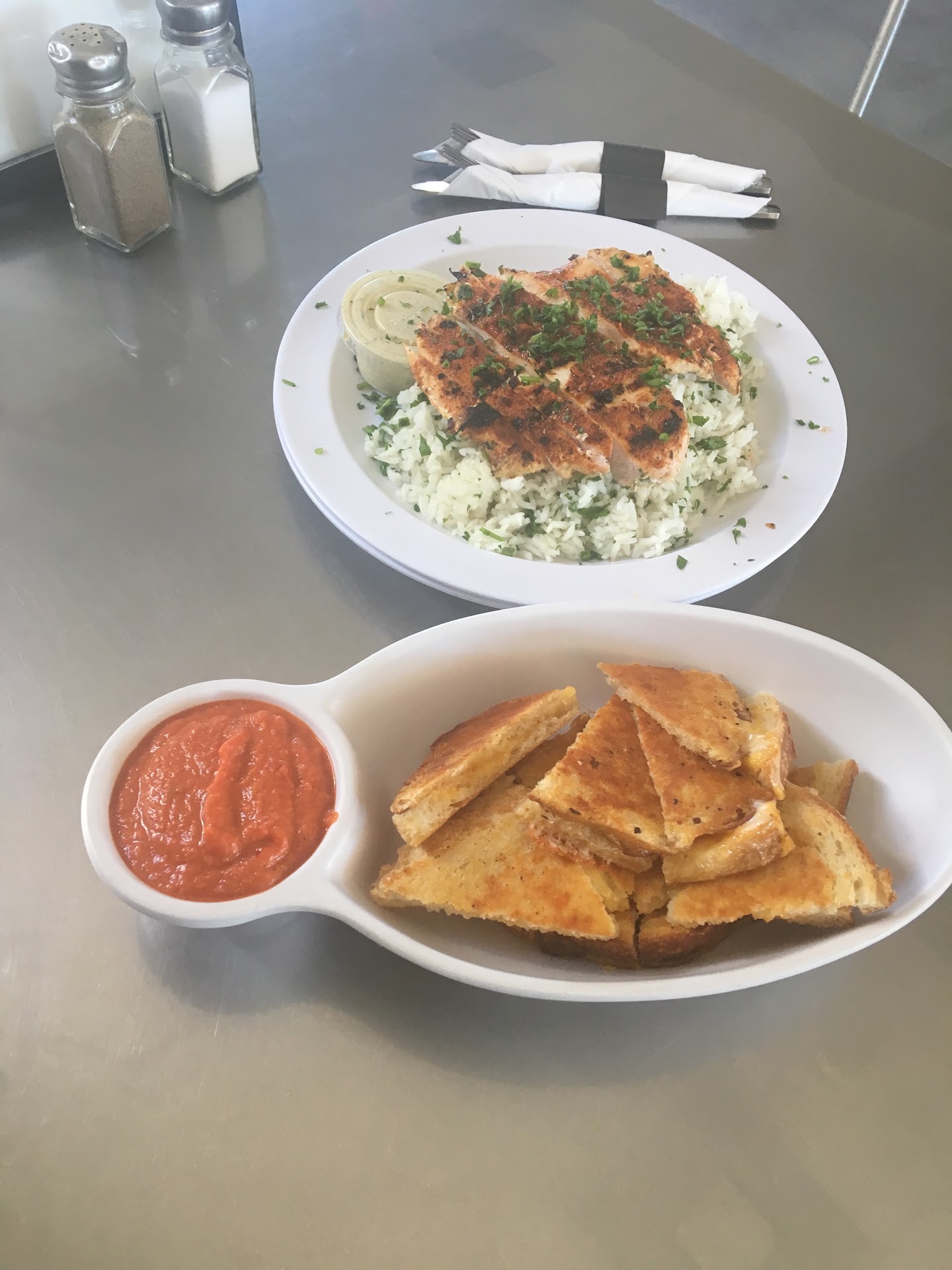 Food Again like I mentioned, everything me and my family ordered was quite good. The only thing is that it could add to be a bit pricey once you get multiple items. Meters Flat Iron steak with Penne Pasta- The steak was quite tasty and tender, and great with their Garlic Apple Aioli. Would order this again! The tomato Penne pasta was really good as well. Blackened Salmon with Herb White Rice- This is for anyone that likes the Salmon a bit more cooked to crisp hence the name, but it was quite good with lots of flavor Fire-Grilled Atlantic Salmon Salad - The grilled salmon was quite nice, and cooked just right Grilled Cheese Dippers- Wow this is so good, I only wish that there was actually more of the dip or I should say tomato basil soup. I didnāt ask if they sold it by the bowl, but definitely going to ask next time.