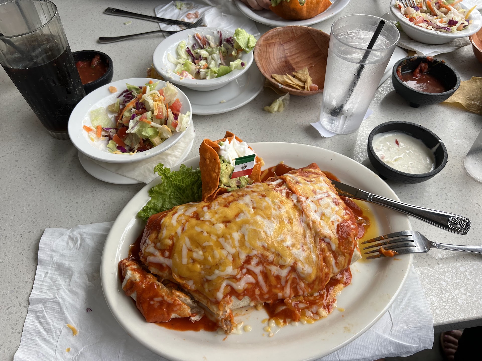 We all ordered a variety of burritos and one of us got the crab and avocado omelet. The burritos tasted okay. I got the Chile Verde burrito and the portions of rice, frijoles, sour cream and guacamole were generous, but the burrito was lacking in flavor in the meat. The seasoning was a little weak, and the meat tasted bland. I also tried the crab and avocado omelet, which was just not good at all. The crab was overcooked and chewy, and the egg overpowered a lot of the flavor.