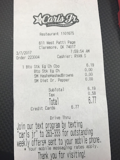 Read moreI had an exceptional experience at the Claremore Carl's Jr. recently, all thanks to Lexi! From the moment I walked in, she greeted me with a warm and genuine smile that made me feel welcome. Lexi was incredibly attentive and took the time to ensure my order was taken correctly and efficiently. She demonstrated a high level of professionalism and friendliness, which is rare to find these days. Not only was she quick to take my order, but she also made sure that everything was prepared to perfection. She checked in to see if I needed any additional condiments or if there was anything else she could do to enhance my dining experience. Her positive attitude and willingness to go the extra mile truly set her apart. The restaurant was busy, but Lexi handled everything with grace and composure. She managed to keep a smile on her face and maintain a pleasant demeanor, even during the rush. It's clear that she cares about her customers and takes pride in her work. Overall, Lexi's outstanding customer service made my visit to Carl's Jr. a memorable one. I will definitely be returning, and I hope to see her there again. Thank you, Lexi, for making my day a little brighter with your...