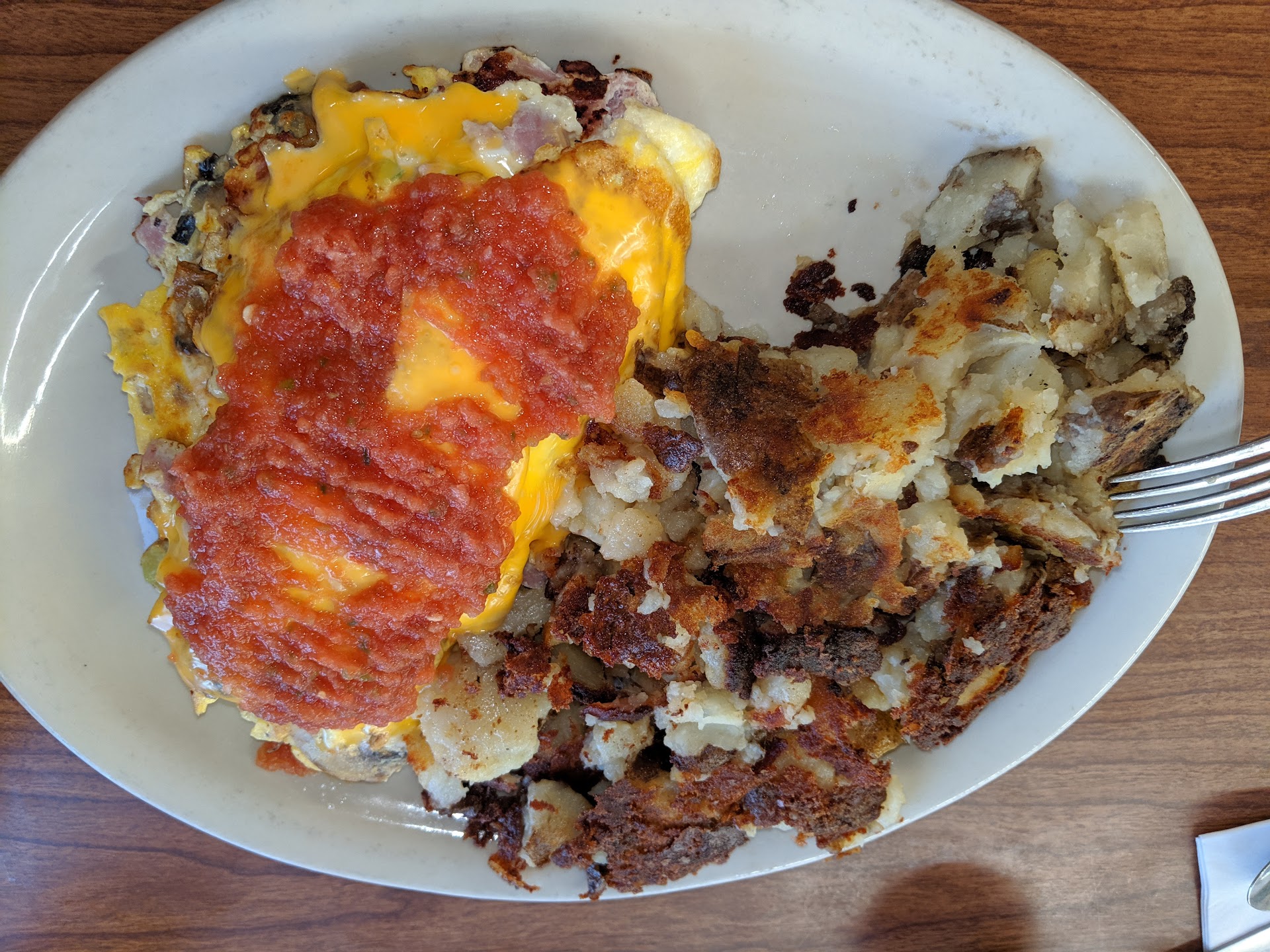 I've had my eye on Hugo's for some time, and on the advice of a good friend, we headed over last Sunday for breakfast. When there's a wait, you know it's probably going to be good. We pulled in, found a parking spot and got our names on the list. Was advised it would be about a 15-20 minute wait. We returned to the car to bide our time, and sure enough, at around 15 minutes, we heard our name. First, the place is very homey. I like that. Also very Pro-American. Like that a lot too. Also... it was packed. That's usually a great sign too. We were seated in a booth amid the noise and chaos. Yeah, it's not a quiet, cozy place to eat. Servers are dashing back and forth, tables are being bussed and dishes clanking. All the hallmarks of a great, old school diner. Orders were placed all around and we settled down to chit chat and wait for the food. The Son and The Kid both had the chicken tender platters, 2x on fries. The Wife had the Denver Omelet (I call them Western Denver Omelets, because I don't know the difference), and I had the venerable ham and cheese omelet. Also, as an afterthought, and because I'd read Yelp! reviews, I ordered a side of bacon for the table. Food arrived in pretty short order, and literally filled the table. Warning... do not come here if you're not hungry. The offsprings' chicken tender plates were loaded down with food. Fries were good, and chicken tenders were well cooked without being overdone. Good flavor, texture, and juicy. A good effort. The omelets were 4 egg omelets, so they're a tad bigger than most places. Plenty of filling, cooked well, and tasty. Also on deck was a generous serving of German fried potatoes, which were a welcome change from the hit-or-miss hashbrowns most places throw down. Also offered was a generous bowl of gravy and an impressive biscuit. Centerpiecing the table was a platter of bacon with easily a dozen strips on it. And it was pretty freakin good bacon too. Overall, there was not one single think I could find fault with. Good food, great service. Just a warning to first timers, it's a cash or check only place. No plastic. They have an ATM in the corner, so you're not gonna wash dishes if you don't have cash. Hugo's bumped way up on our new breakfast locations, and it should rate high on...