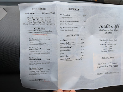 I discovered Thai cuisine in the early '80's at Renu's on lower Westheimer in Houston. Thai food was still a polite, self-effacing visitor at the American table. In 1982, Esquire's John Mariani, always on the lookout for the unique -- well-executed and honestly presented -- named Renu's one of the top 200 new restaurants in the country. I became friends with Renu (Somaratne) and thought her food could never be matched, that hers was the only Thai ticket to heaven. Well, Renu was to return to Thailand for personal and family health reasons, but I kept looking and tasting and tasting and looking. Finally, I gave up the active pursuit. I quit grieving. And now!!! Patience will have its perfect discovery! Chantho Bouphaphanh, main chef, and her diffidently gregarious husband, Hong, and the eponymous Jinda (their daughter Laura "Jinda") have been at it in Clarendon, Texas, for about a year, having left the crazy world of San Francisco Asian cuisine. The food at Jinda IS AS GOOD AS IT WAS AT RENU'S! The real deal. Please go. Whether a Mariani devotee or a Trillin chum, you'll get Thai family kitchen fare unsurpassable in taste, presentation, and humility. And such fine people. Please go....