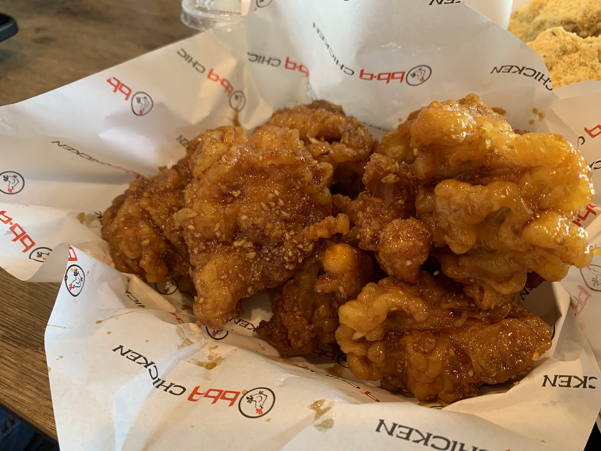 Read more10/10 would HIGHLY RECOMMEND! This was our first time. We got the golden original half chicken, small 8 ct honey garlic bone in wings, kimchi fried rice 🔥 with complementary pickled radish option. Starting off they let us know there was a 15-20 min wait on food, so I knew right away it's fresh because there was only one couple there when we came and maybe 2 Doordash orders. She brought the kimichi fried rice first. The fried egg on top is crispy on the sides and I love that and topped with toasted sesame seeds it gave a beautiful flavor and smell. It had green bell pepper, green onions and chicken so it's very filling dish and served in a big bowl and it has a kick 🔥 but the pickled radish is so very helpful here because it cleanses the palate and cools down the spice. I recommend taking a bite of radish between trying the different flavors. Next, the chicken came out and it's super fresh and hot. The golden original has a slight sweet smell to it and amazing crunch. The chicken is very juicy and delicious. The honey garlic is my favorite, it's sweet and savory. I love how their chicken stays crunchy even when tossed in the sauce. Most places can't do that! Korean fried chicken is delicious! Also, the pickled radish is not salty nor briny tasting for the those who dislike pickled vegetables. It actually is sweet, refreshing...