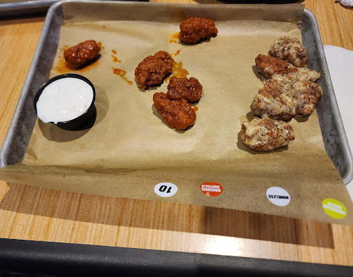 Food was finally brought out and chicken was lukewarm to warmish. Not the hot boneless wings I've come to expect. Sauces were correct. We finished the dinner, our drinks were kept topped off, and we paid our bill. Before leaving, we went to the restroom to wash up.