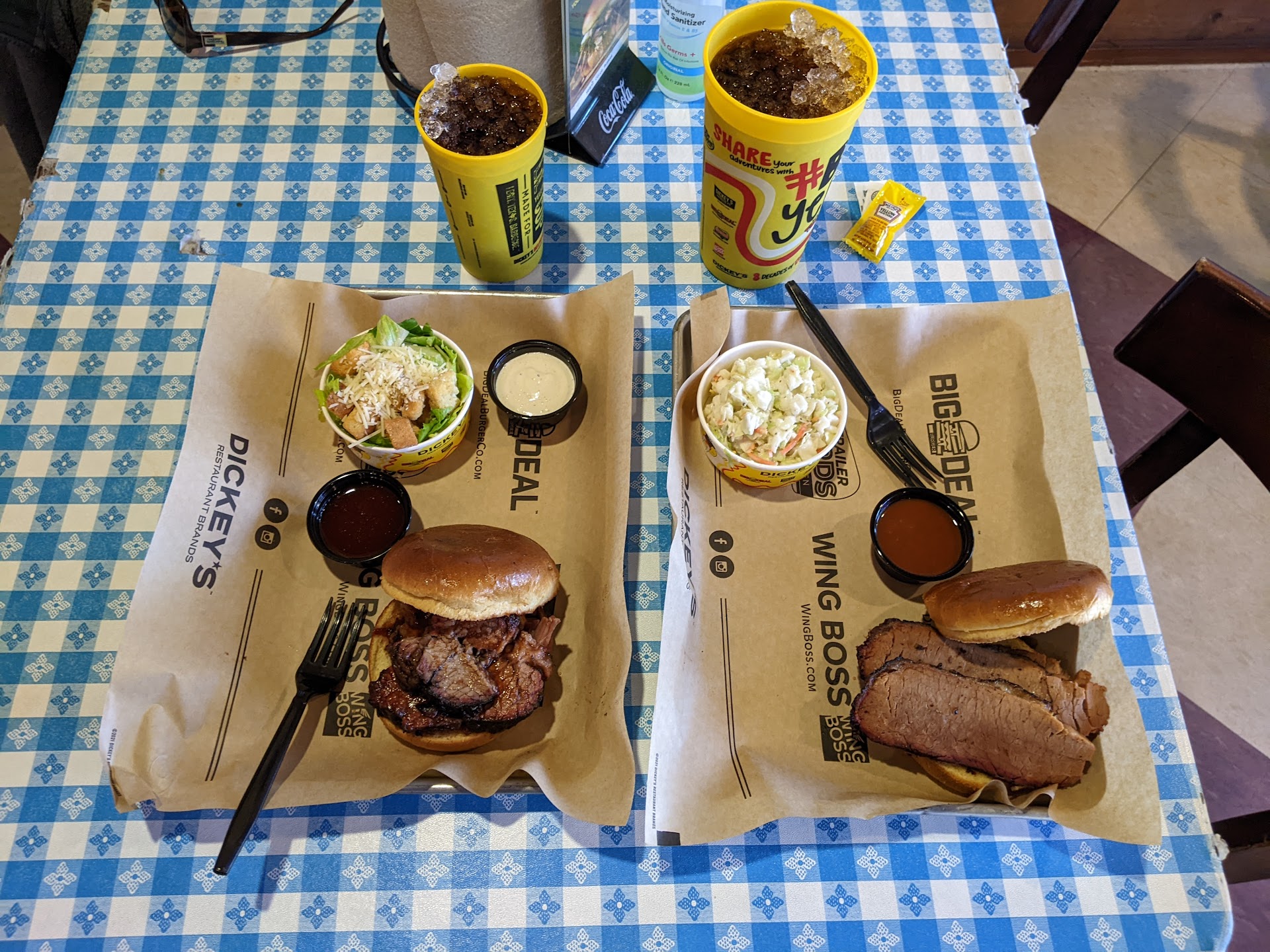 Read moreThe best I can say is that our visit was OK. Good, but not great. I had a brisket sandwich with a side of cabbage slaw. The slaw was very fresh and crisp and was very enjoyable. The brisket meat was unlike any I had either seen in a restaurant or made myself. The portion was generous with little fat. It was a little dry and the meat was a little crumbly. The meat had an overall reddish tint to it. I'm used to seeing brisket as a greyish pink color with a little shine to it from fat. This brisket was dull with no shine. I can't prove it, but I think this was leftover from last night. My wife had a beef burnt end sandwich. She commented that it was good, but it wasn't exactly burnt ends. It was just chopped brisket with little of it burnt. She liked her Caesar side salad, but for the price she felt the portion was a bit chintzy. The fountain sodas were good and there were plenty of condiments available. When we left, two older couples (like us) ordered and the cashier offered them a senior discount. This was not offered to us, but maybe we looked a lot younger? Cashier was apparently new. She didn't ring up my wife's side salad and she rang up two identical brisket sandwiches instead. Regardless we spent about $27. The cashier's manicured nails were way too long to wear in a food service environment, we thought. The manager came out to the dining area with his laptop but sat in the back. He didn't greet anyone or ask how our food was. The store was very clean. Brown paper towel rolls and hand sanitizer were on each table. Last bite: Their rewards app wouldn't accept our receipt to give us rewards points. This Dickey's isn't as good as Mission BBQ by comparison. We'll try this...