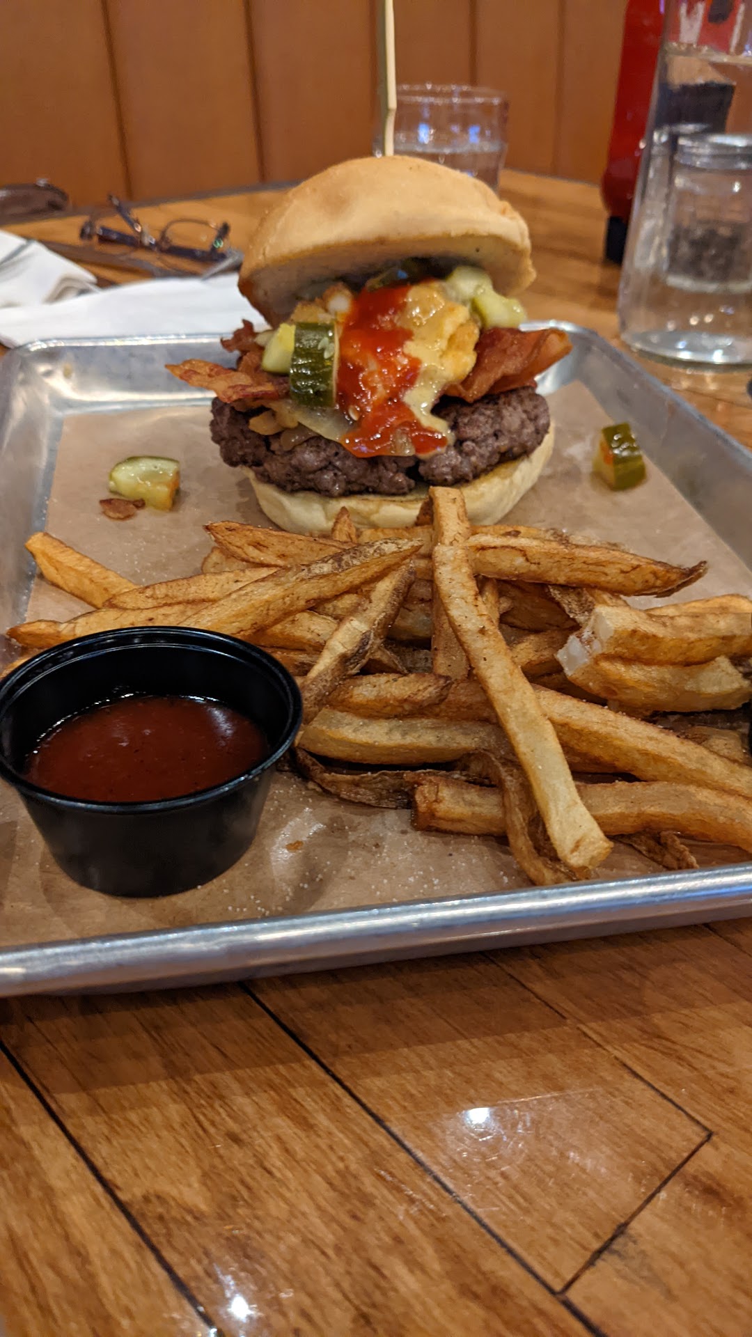 I ordered the Bayou Burger with salt-n-pepper seasoned fries and my wife ordered the Rocky Top Burger with the same fries. I could have opted for some seasoned fries, but I wanted to focus on that Fire & Smoke sauce for the fries.