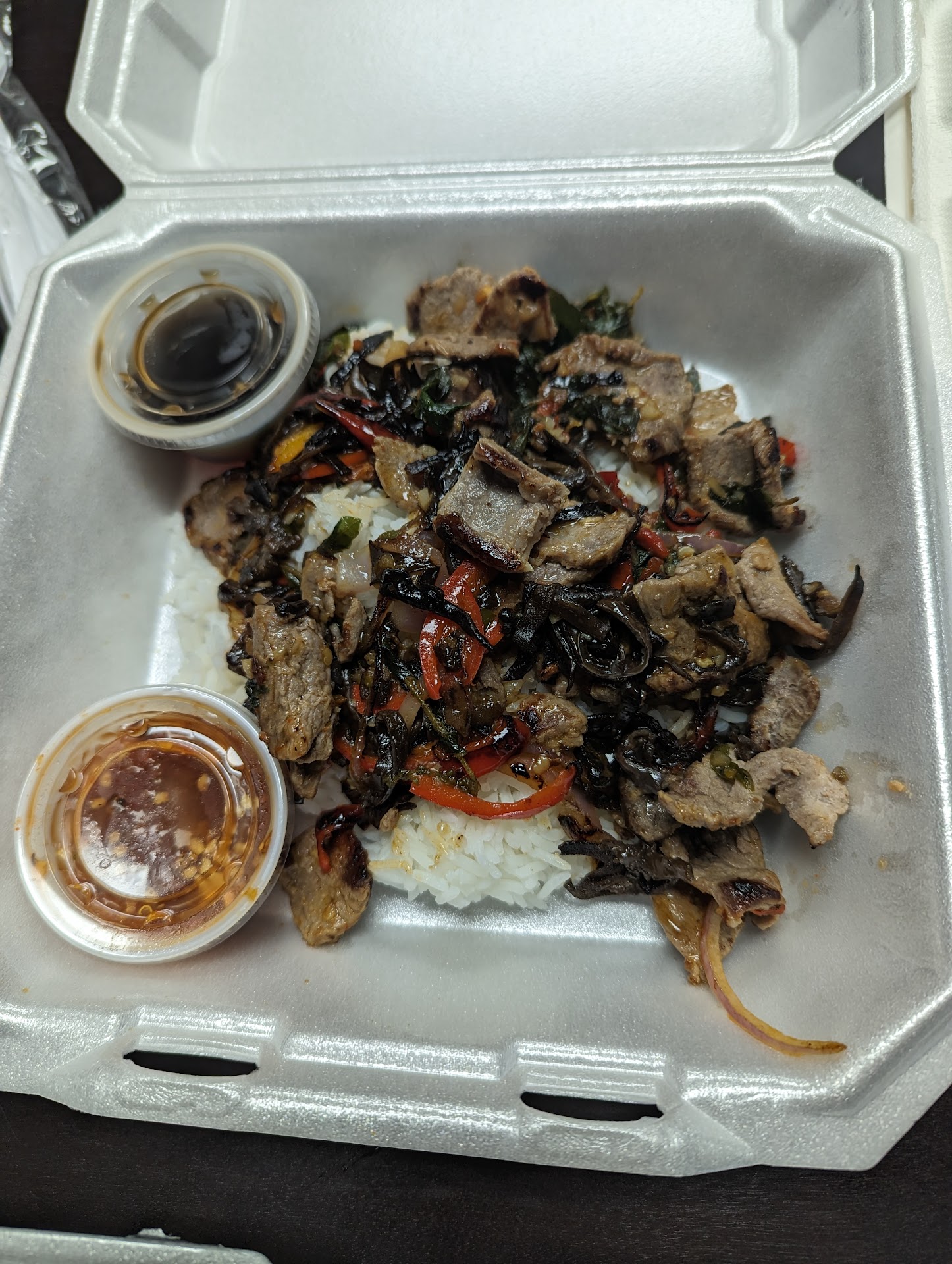 For my lunch I got the Hot Basil Stir Fry with beef and fried rice instead of the steamed rice. So full of flavor. A very generous portion of some of the best fried rice I have ever had! The beef was cooked amazingly with the mushrooms and hot peppers...this is a fantastic meal, the heat hits you and stays with you throughout the whole meal - PERFECT.