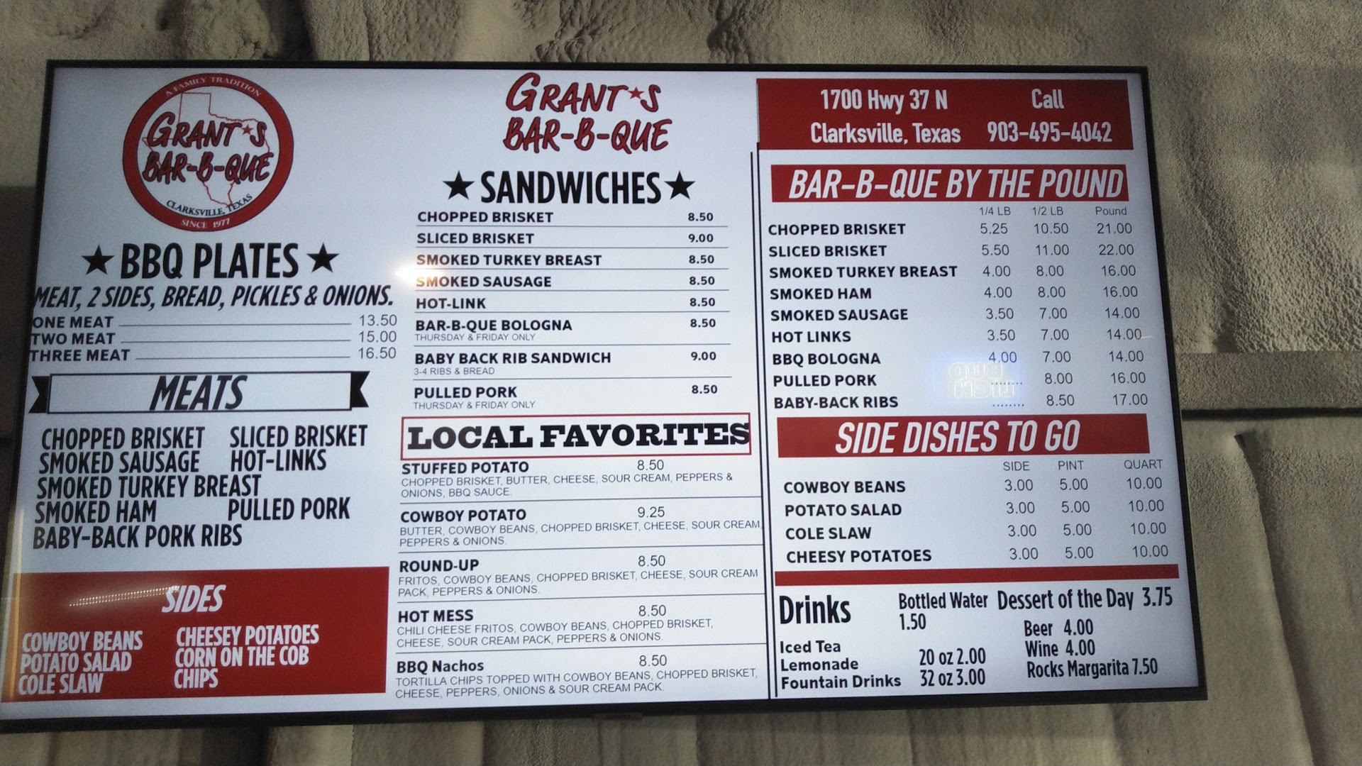 Read moreWe were going to go camping in Broken Bow for about a week the other day and got up there and turned around because of the weather and stopped by Grants in Clarksville on the way back home. Never been there before. Took it home and went back up to Broken Bow the next day and stayed several days. Our first experience was so good at Grants that we stopped by on the way BACK home and got some more. Very good stuff. We got sliced bbq, BBQ sandwiches and BBQ turkey. It was all so good. We will be a regular customer from now on. Looking forward to them getting in their...