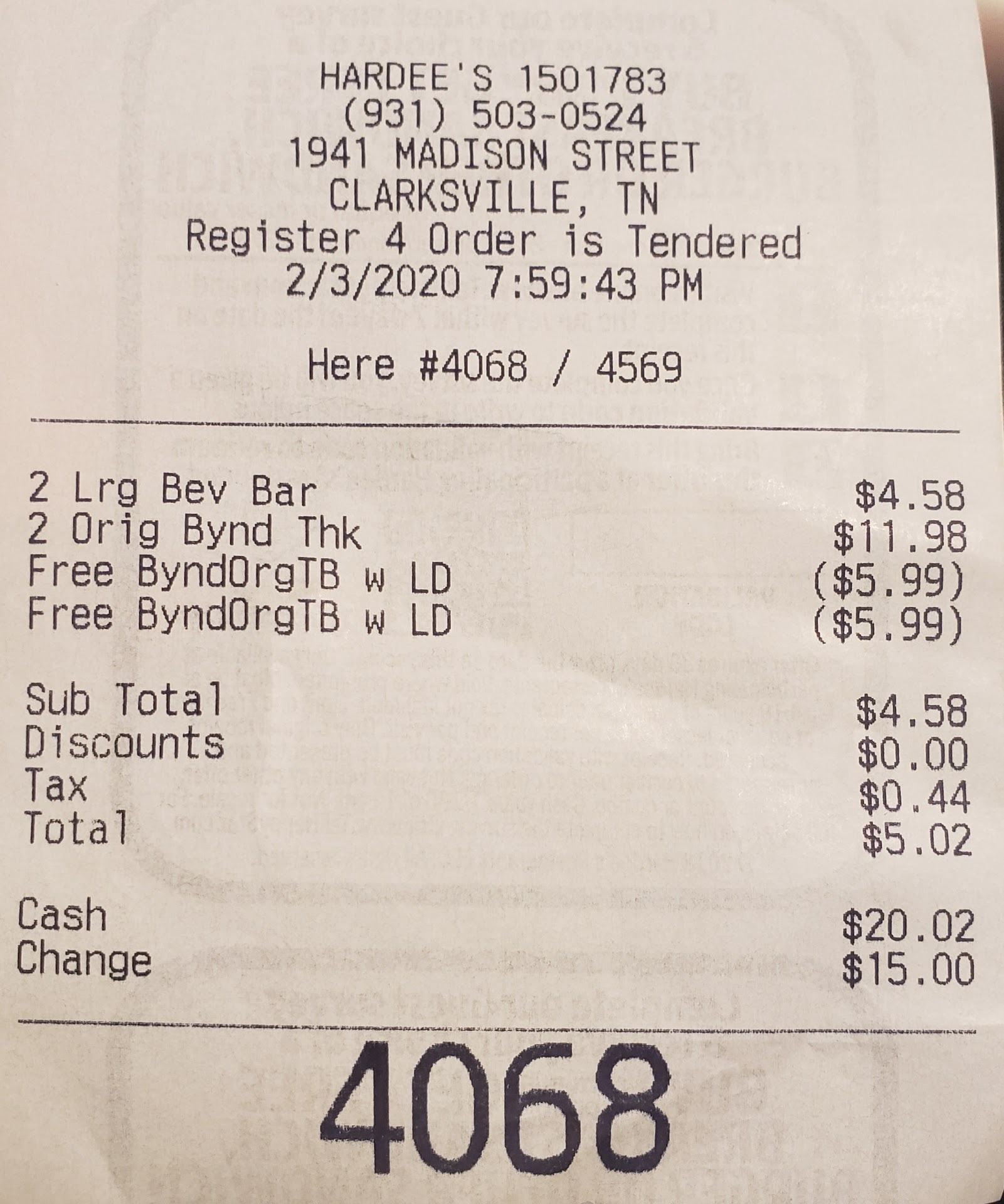 Read moreShout out to the employee wearing the beige sweater who took our order this evening (2/3/20) and even brought our meal to our table. I wish I got her name! Very polite, professional, and personable. Participating Hardee's gave free Beyond Burgers with the purchase of a large drink today, so we figured... why not, give it a shot? So glad we did. The burger tasted awesome! Fresh, crisp lettuce, fresh tomato, onion, pickles, Beyond patty with cheese, and mayo on a lightly toasted bun. When going to a fast food joint, naturally, your expectations are not too high. But our sandwiches were made with expert care. Not too much mayo and not just slopped on, either. Our burger looked very similar to what was advertised online... something I've NEVER witnessed at a fast food restaurant. And the fries were hot and crispy, not limpy, and perfectly salted. Needlessly, we were pleasantly surprised, hence, the detailed positive review. As for the restaurant itself, the soda machines could use an update and the dining area could've been a little cleaner (napkin dispenser on our table was very dusty). We didnt use the bathrooms so I can't comment there. But, the establishment is wheelchair accessible and is a good place for kids (no play...