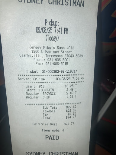 Read moreLove Jersey Mike's food. Tonight I went there and they had a young black man, probably 15 or 16, working the dressing/wrapping station. He had short dreads. I describe him because I didn't catch his name. Anyway, I get a 13 with a lot of things on it....in a wrap. It's a tough roll. He took his time, was very careful and the wrap still ripped on him. He quickly got to fixing it with a new wrap, but then took the same care in making my wrap again. No rush. He got it on the 2nd go. The hole time he was cool, polite to me and his co-workers, and again, he seemed to care about getting it right. The wrap was delicious. Really appreciated that young guys style. Usually have good customer service at this...