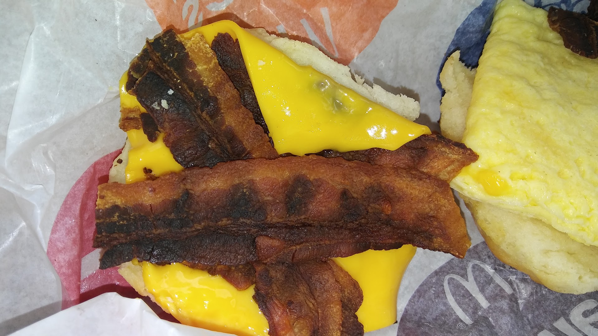 The staff member said she wanted to put your bacon on the side so that it was well done. I didn't bother to check,drove off and There was a biscuit with no bacon( burned bacon in a pancake tray) egg or cheese. Just a plain biscuit.