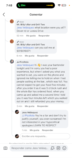 The customer service during my visit left much to be desired. I noticed an unfriendly attitude from the waitress, which made the experience less pleasant. I hope you can take steps to improve the service, as this is key to customer satisfaction. You deleted the comment on Facebook and you were rude to the person who called you for me, you even hung up on him! But here you will NOT be able to eliminate this opinion and to everyone who can I will talk about this bad experience and how rude you are as the owner of the bar! By the way, my cousin was the one who wrote to them on FB because she does like to confront but in view of the fact that he was rude with the call he made! Well, now I understand why the employees in addition to being rude are liars, I spent 50 minutes waiting for a stupid hamburger that they never...