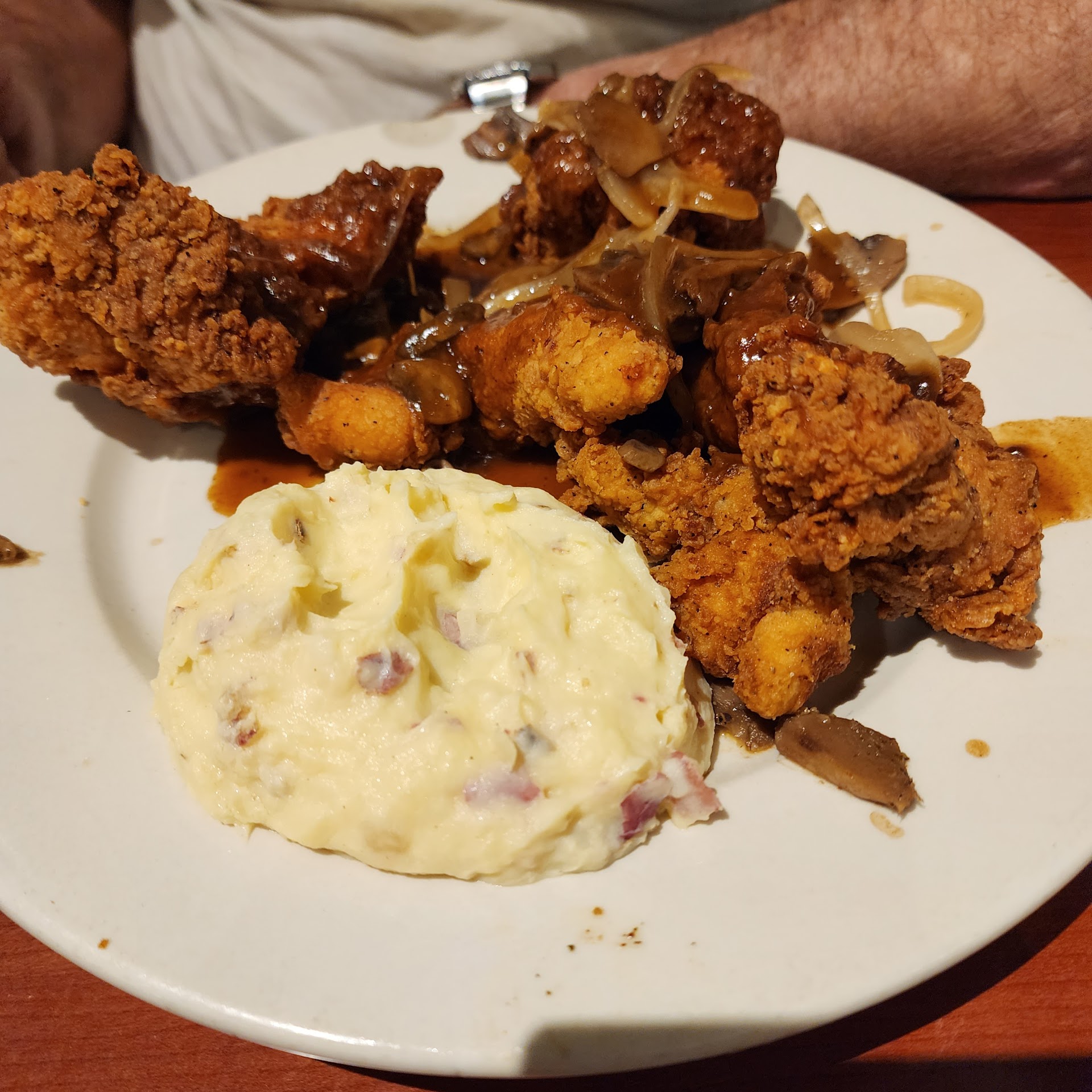 Ā Ā Ā Read moreRarely leave reviews but my experience at this location was so bizarre today I have to leave a review. First I have to say my wife and kids meals were great. They got chicken tenders, shrimp, and French fries. The waitress was really good as well. I ordered the 10oz ribeye steak for $18.99. What I got was... well I actually still donāt know. My best guess is some sort of boiled or microwaved cheap beef with a grayish wrapping of spices. Not sure how it tasted because I couldnāt stand the sight let alone the odd texture. Our waitress asked if it was ok since I hadnāt eaten any of it and I was willing to just do the āNa itās ok just not that hungryā game but she could see the āsteakā too and said she would take it back. In 8-10 minutes another steak is brought out by the manager, Alexa I believe was her name. She was very nice but incredibly socially awkward. The āsteakā she brought out was the exact same type of whatever that was brought out the first time except this time with half hearted grill marks. She stood right next to my right shoulder and waited for me to take a bite of the steak to ensure that everything was alright. I made some small talk with her trying to prolong the inevitable and asked her what exactly this thing was that sheās calling rib-eye. I was told that itās stampede boneless 10oz ribeye steak. I was curious how they boiled steak on a grill and she ensured me that the āsteakā was grilled. I finally got the courage up and cut a piece and took a bite of what Iām pretty certain now could have only been human meat or something equally vile. I told her right off that I was about to spit it out, I had to tell her this because as stated before she was right next to my face. She said ok and I spit as much of my mouth and throat out as I could without dying and to be honest dying at that point may have been a blessing. To be fair she was extremely professional minus to social awkwardness and said she would remove it from our bill which was nice because we hadnāt even asked for that. My family has zero complaints about their food and my side salad was good and I didnāt want to bother honestly. Waitress got a nice tip and minus the ribeye Iād recommend the place but that āsteakā was...