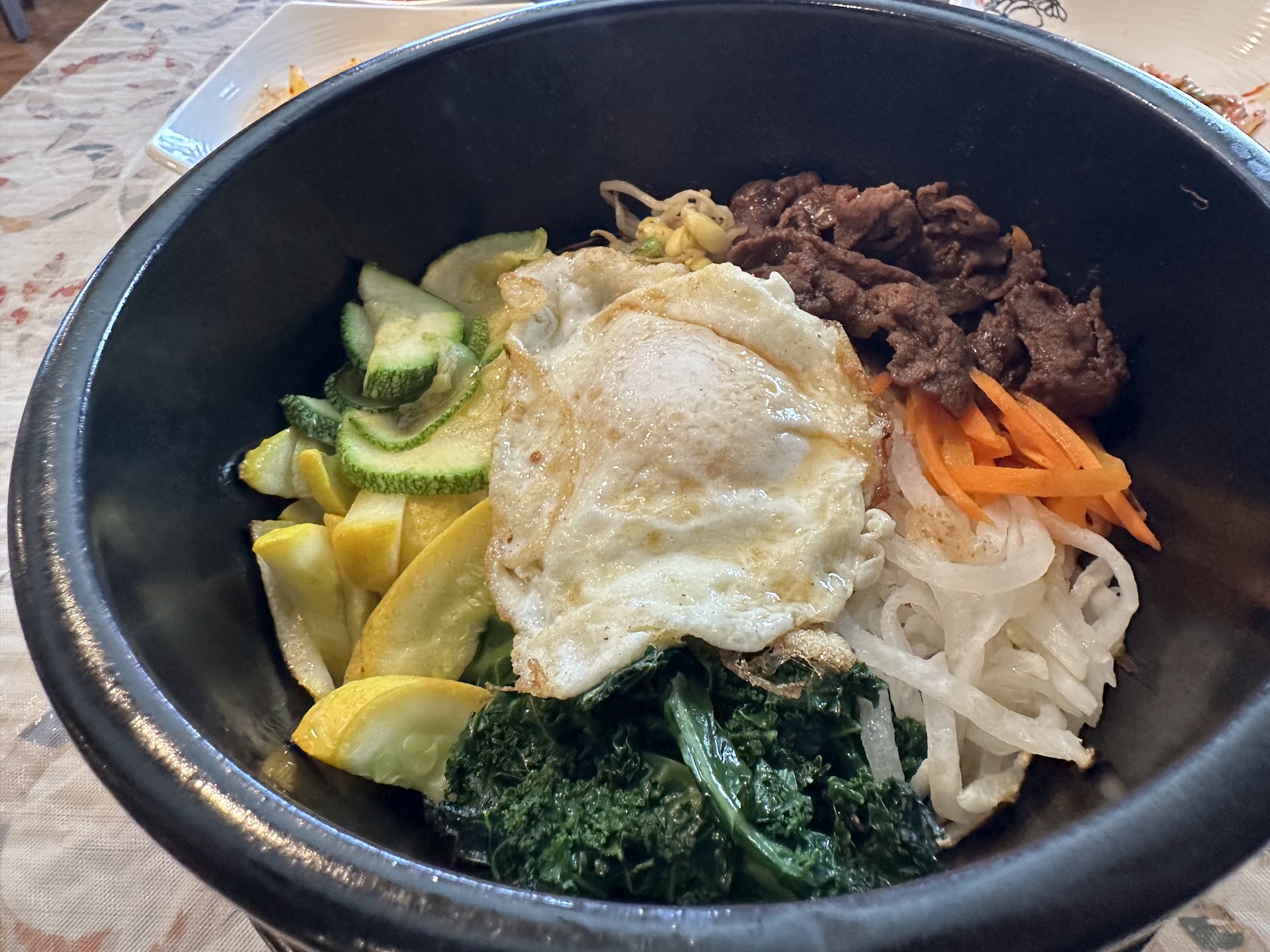 There was a LONG black strand of hair in our dish of Bulgogi. The restaurant was cold - and they are very stingy, not wanting to give seconds on sides. The sever failed to clean the table of used plates....
