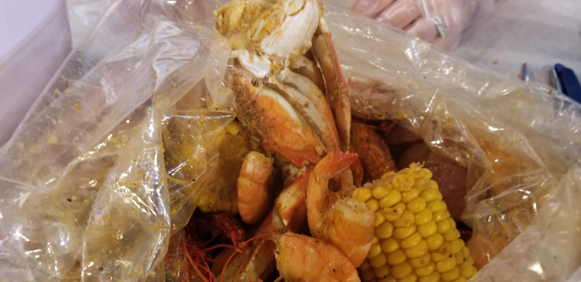 As we were finishing our appetizer, our entree arrived! We had ordered Special #2 but substituted crawfish for the clams that normally came with this bucket of seafood. The special we ordered came with a whole Dungeness Crab, one pound of shrimp and one pound of crawfish! On top of all that we got three pieces (half ears) of corn on the cob, about six redskin potatoes (sliced in half), and several dozen slices of smoked sausage all cooked in a large bag, filled with butter and the type of seasoning you choose. The options were Old Bay Butter, Garlic Butter or Cajun Butter. We chose Mild Cajun Butter as mentioned earlier. The amazing part was the fact that, even though they had only been open a few weeks, the chefs cooked the seafood like they have been doing it for years. It all comes out in a bucket and a large plastic bag. The corn was sweet and savory; the potatoes were moist; the sausage had been sauted to perfection; then the best part was the seafood. The crawfish slid right out of it's shell, and the shrimp was the best shrimp I think I have ever tasted. Then the crab! It was perfection. As soon as you cracked open the shell, the crab easily fell right out allowing me to dredge it in the Cajun butter that it had been cooked in. And the portions they gave you were amazing. It was like the gift that keeps on giving. Also with your meal the staff also provides you plastic gloves, an apron and the normal seafood extraction tools, to protect you from the butter bomb that's about to explode at your table.